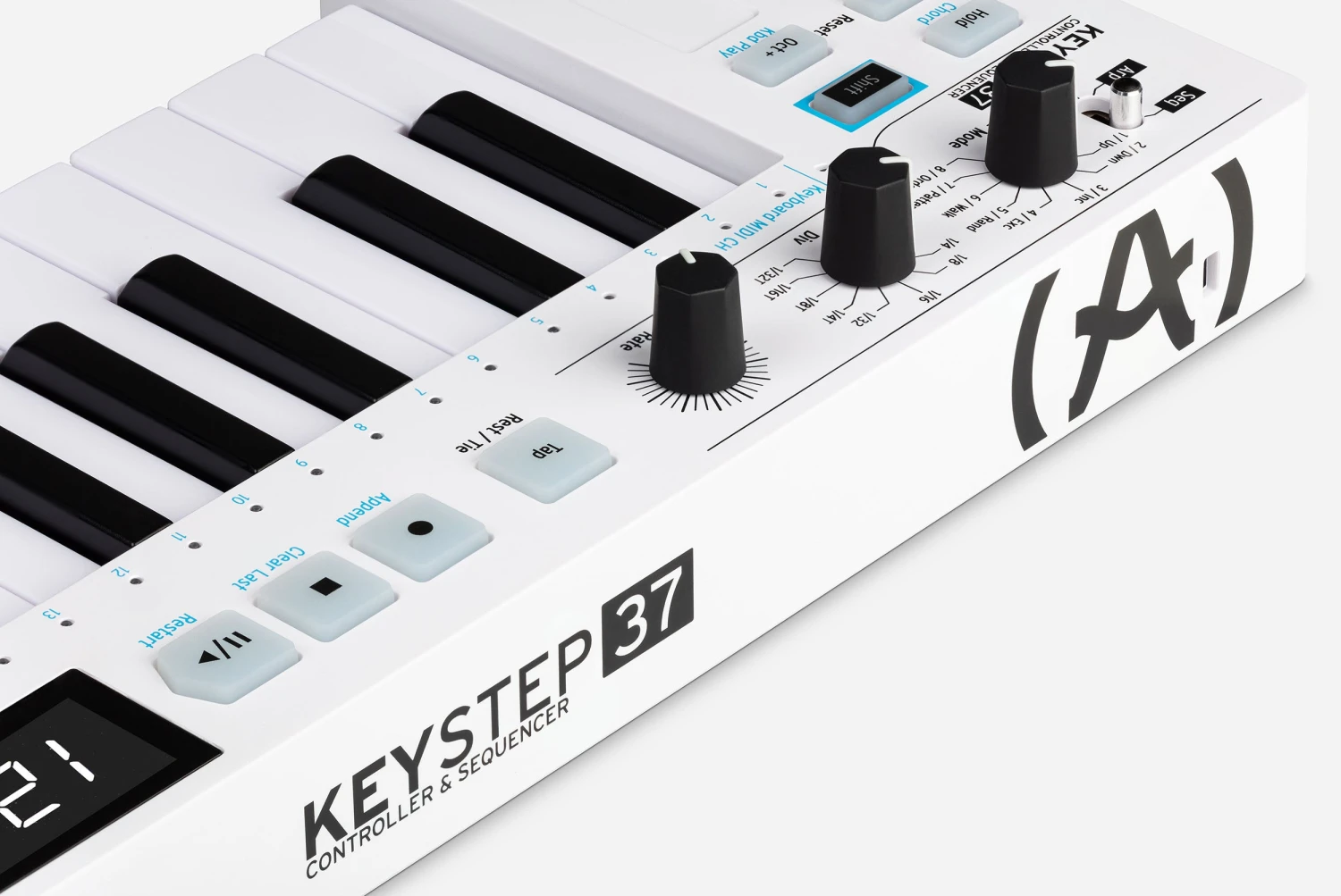 - Rate control and tap tempo: REC, PLAY, and STOP buttons for performance control over the sequencer and arpeggiator