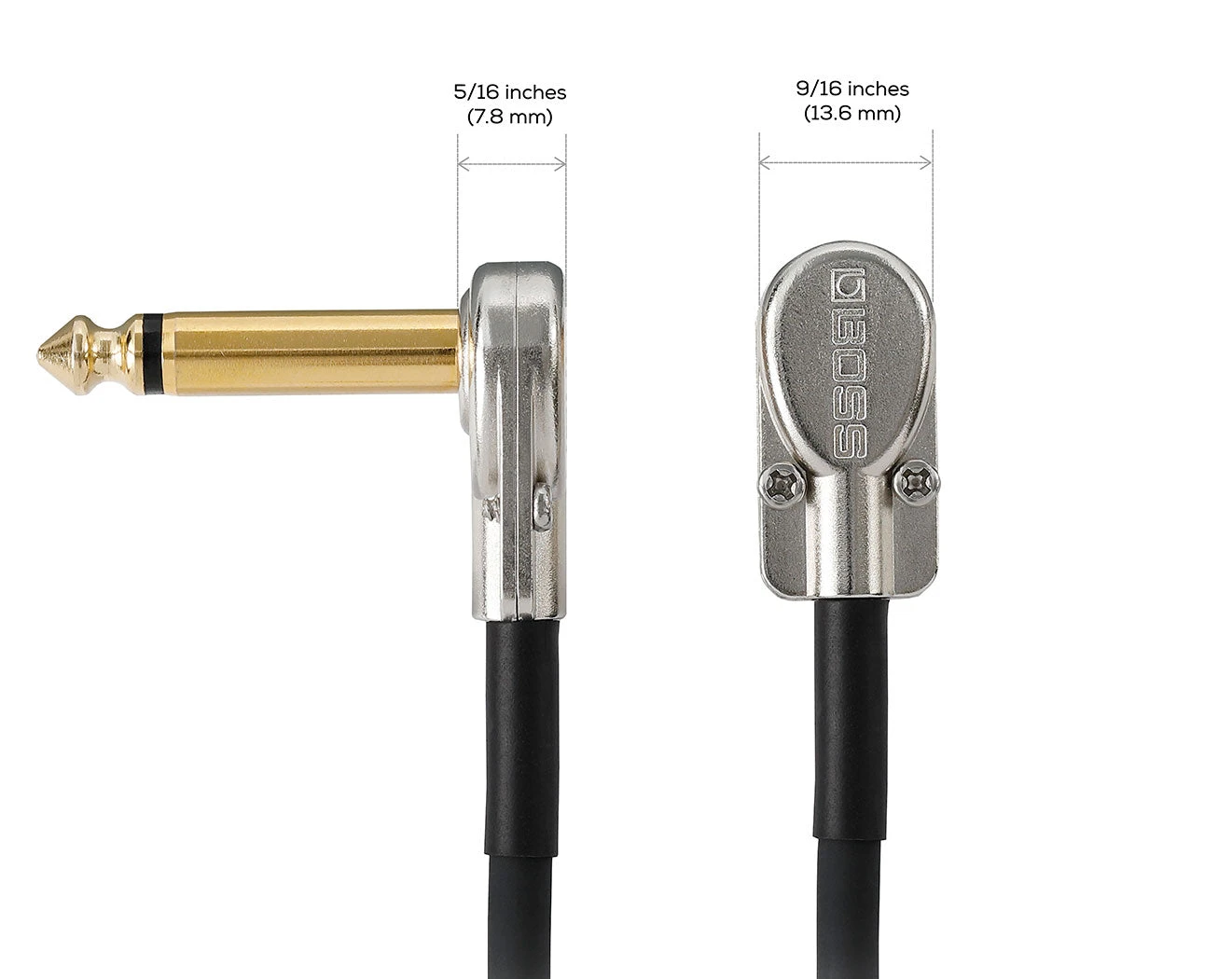 Combining high-quality audio performance with a unique space-saving design, BOSS BPC patch cables help maximize real estate in any pedal setup. Our custom-designed slimline pancake plugs fit on pedals and switchers with tight jack spacing, and feature 24K gold-plated contacts for corrosion-free operation. The oxygen-free copper center conductor keeps your tone intact, while heavy-duty braided copper shielding blocks noise and enhances durability.