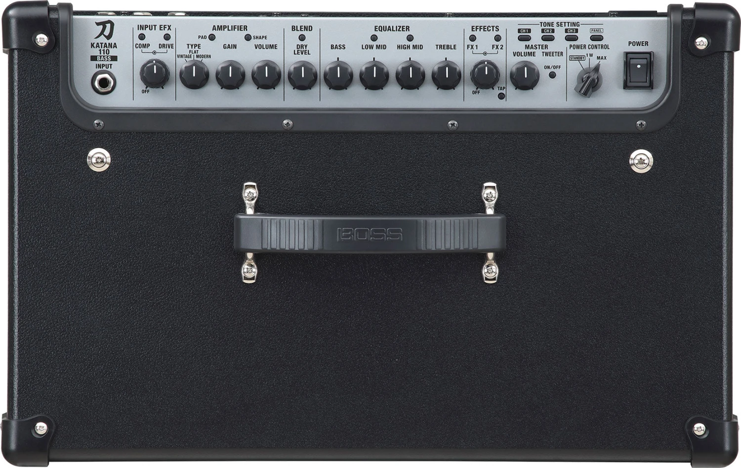 Crafted with the breakthrough design philosophy behind the acclaimed Katana guitar amp series, the Katana-110 Bass delivers premium sound and advanced features perfectly tuned for the needs of serious bassists. Three unique amp characters and onboard BOSS effects provide a wide range of tones, backed by a stage-ready, 110-watt class AB power amp, custom 10-inch woofer, and tweeter with on/off switch. And with comprehensive EQ, flexible connectivity, and more, the Katana-110 Bass is ready to take on any playing situation, from stage to studio to everyday practice at home.