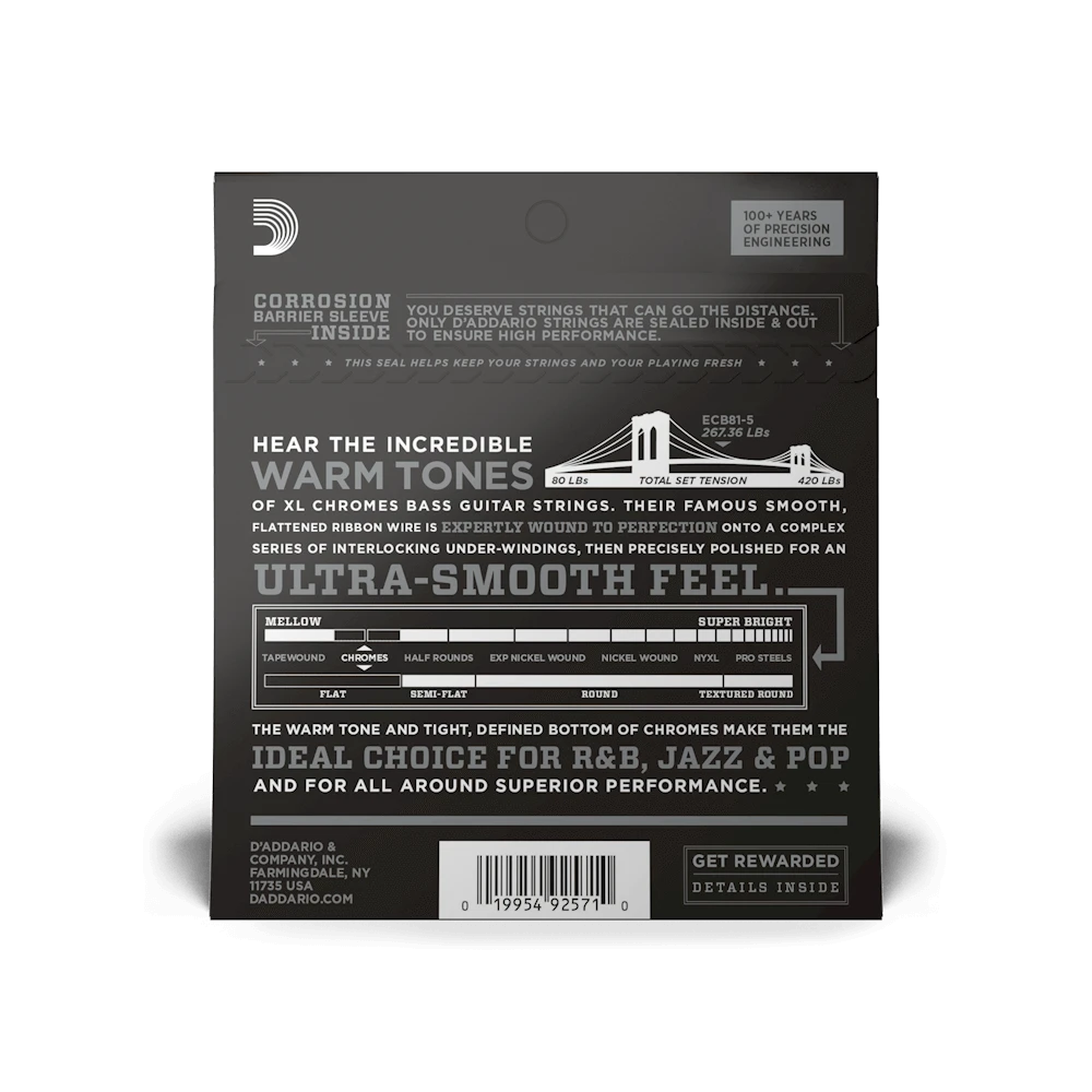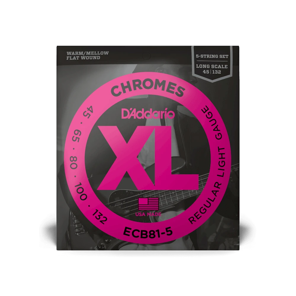 XL Chromes are among the warmest, mellowest bass strings we have to offer. These flat wound strings provide an ultra-smooth feel and a dark, yet warm tone, while allowing movement across the fretboard with no finger noise. Made with a high carbon steel core, Chromes stainless steel flattened ribbon wrap wire is expertly wound onto a series of interlocking under-windings, then precisely polished for unparalleled smoothness and a tonal presence which blends beautifully into the mix. Made for 5-string basses, 45-132 Regular Light gauge strings take our most popular bass gauge and add a low B-string.