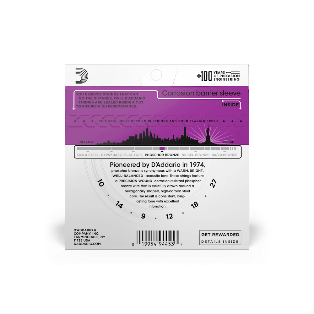 D’Addario was the first to use Phosphor Bronze in acoustic guitar strings back in 1974. Today, Phosphor Bronze is played throughout the world and considered to be the standard in acoustic strings, thanks to its beautiful sonic balance and tonal warmth. Our pioneering Phosphor Bronze acoustic guitar strings are precision wound with phosphor bronze wrap wire over a high-carbon steel core, providing tonal versatility suitable for all acoustic styles and musical genres. This 10-27 High Strung/Nashville set is designed for “High Strung” or “Nashville” tuning methods, to offer a “jangly” 12-string effect when recording, layering, or double-tracking guitars.