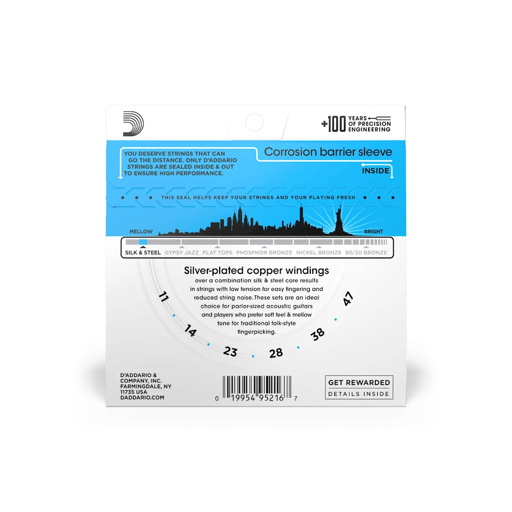 Silk and Steel were uniquely designed to be our warmest, mellowest acoustic guitar string. Ideal for parlor guitars and vintage instruments, the softened tone of Silk & Steel is often preferred by folk players. Made with silver-plated copper windings, over a combination silk and steel core, the low tension and reduced finger noise of Silk & Steel is well suited for mellow acoustic vibes and fingerstyle playing. This 11-47 Light set is easy to play and provides a warm tone.