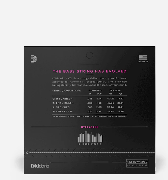NYXL bass guitar strings thump harder, bend farther and sound thicker than any bass string you’ve played before. As our premium uncoated bass string, NYXL bass strings provide higher break strength, enhanced tuning stability, and accentuated harmonics where it counts. Using a NY Steel core, Fusion Twist technology, and premium nickel-plated steel wrap wire, with a reengineered core-to-wrap ratio, NYXL bass guitar strings deliver extra versatility, familiar feel, and a boosted tone that’ll expand the scope of your low-end. This 40-100 Regular Light gauge set has a nice even tension, bright tone, and tight low-end.