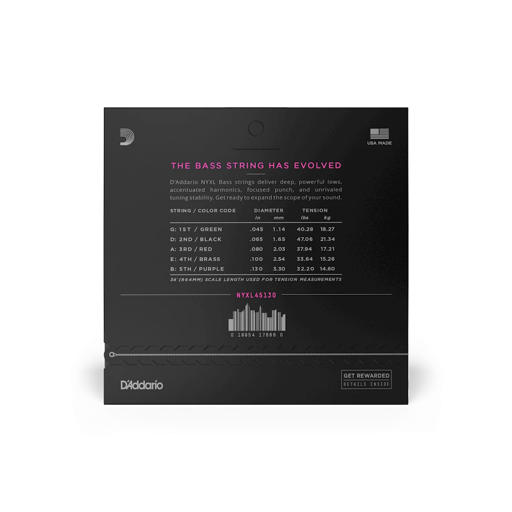 NYXL bass guitar strings thump harder, bend farther and sound thicker than any bass string you’ve played before. As our premium uncoated bass string, NYXL bass strings provide higher break strength, enhanced tuning stability, and accentuated harmonics where it counts. Using a NY Steel core, Fusion Twist technology, and premium nickel-plated steel wrap wire, with a reengineered core-to-wrap ratio, NYXL bass guitar strings deliver extra versatility, familiar feel, and a boosted tone that’ll expand the scope of your low-end. Made for 5-string basses, this 45-130 Regular Light gauge set takes our most popular gauge and adds a low B-string.