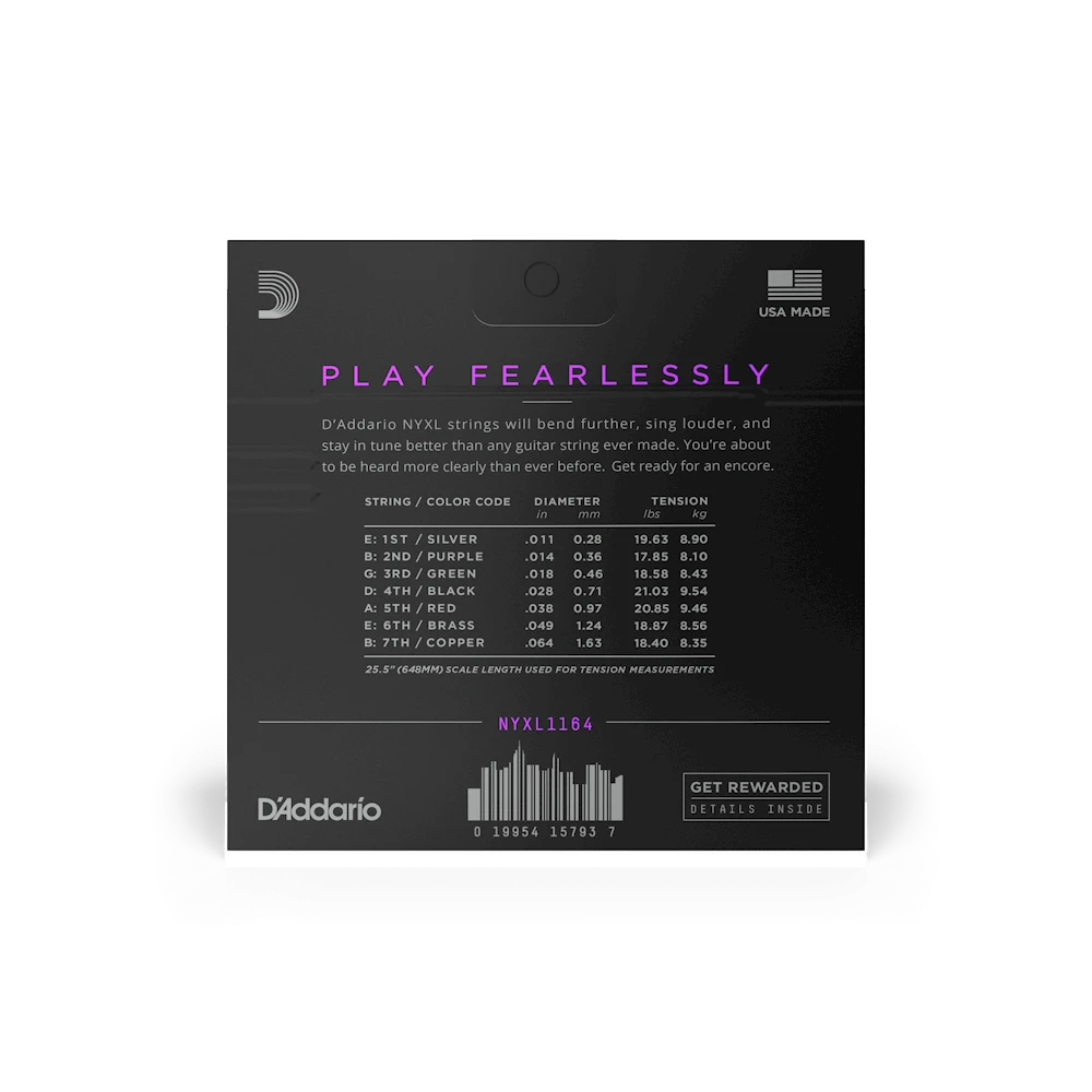 NYXLs will bend farther, sing louder, and stay in tune better than any string you’ve played before. As our premium uncoated electric string, NYXLs offer higher break strength, enhanced tuning stability, and accentuated mid-range frequency response, providing more presence and crunch to cut through the mix. Made with a NY Steel core, premium nickel-plated steel wrap wire, and Fusion Twist technology, NYXL electric guitar strings are tough enough and versatile enough to handle anything. This 11-64 Medium 7-String set is designed with larger gauges for moderate flexibility and a full tone.