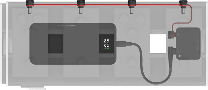 The XPND Pedal Power Battery Kit is an all-in-one pedalboard power solution, on or off the grid. Cut the cord with the rechargeable 10,000mAh Portable Power Cell, capable of powering an average-sized board for 10+ hours, or go on the grid with the USB-C power supply. The kit’s patent-pending Gateway hub combines USB Power Delivery protocol with proprietary noise filtering for ultra-quiet, consistent 9-volt power. The included Adjustable Daisy Chain allows you to customize the plug spacing to your specific needs and the kit includes a hook fastener for mounting it all to your XPND or any other pedalboard. Expand your power with XPND Power Solution.
