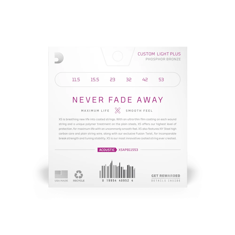 Born from our greatest breakthrough in string innovation, XS Phosphor Bronze strings have the longest life of any D’Addario acoustic guitar string. The XS coating gives our warm, balanced phosphor bronze strings maximum life, with an uncommonly smooth feel. Made with a NY Steel core, phosphor bronze wrap wire and Fusion Twist technology, XS coated acoustic guitar strings have incomparable break strength and tuning stability, in addition to their dramatically increased lifespan. 11.5 – 53 Custom Light Plus balances our two most popular gauges, featuring light tension on the bottom strings and slightly lighter tension on the top for bending and soloing.