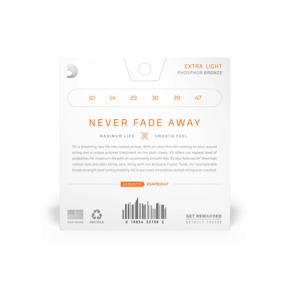 Born from our greatest breakthrough in string innovation, XS Phosphor Bronze strings have the longest life of any D’Addario acoustic guitar string. The XS coating gives our warm, balanced phosphor bronze strings maximum life, with an uncommonly smooth feel. Made with a NY Steel core, phosphor bronze wrap wire and Fusion Twist technology, XS coated acoustic guitar strings have incomparable break strength and tuning stability, in addition to their dramatically increased lifespan. These 10-47 Extra Light gauge XS strings are easy to play and easy to bend.