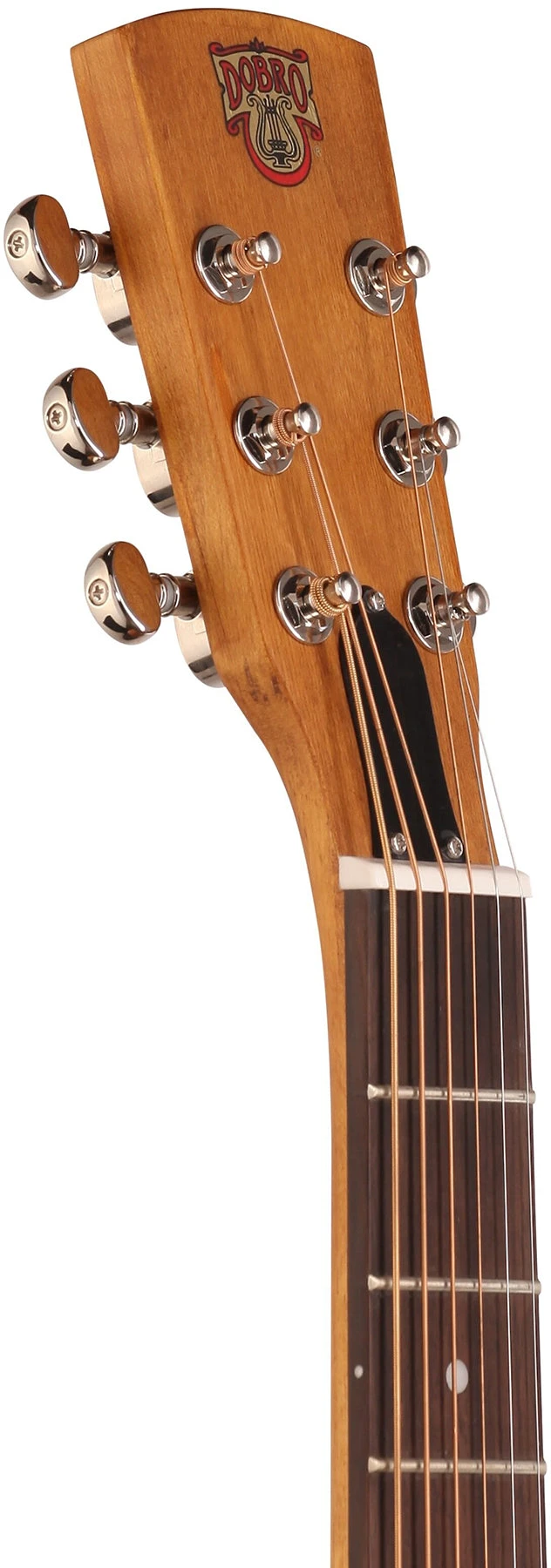 The Dobro® resonator guitar has been an American classic since its arrival in the early 1920’s. The wood resonator or resophonic style guitar became a national phenomenon thanks to Dobro pioneer Bashful Brother Oswald, who became the instrument’s virtual ambassador, performing it weekly on the Grand Ole Opry for over 60 years. The resonator guitar is still an iconic instrument for bluegrass and traditional American music. In the last decade, popular artists in country, blues, and bluegrass have rediscovered the beautiful and challenging Dobro. Historic Tone With A Twist In addition to the bridge’s ebony saddle which sits atop a maple base, the full warm tone of the Hound Dog Round Neck is enhanced and projected by a new proprietary nickel plated Dobro® cone with a nickel fan cover plate, round sound holes with screens, and classic f holes.