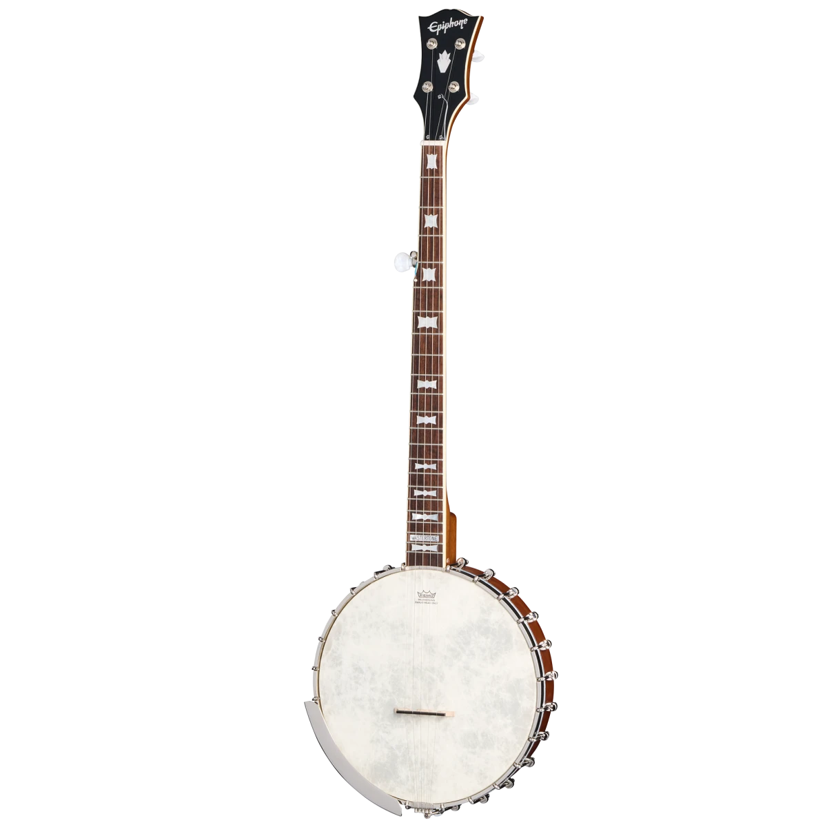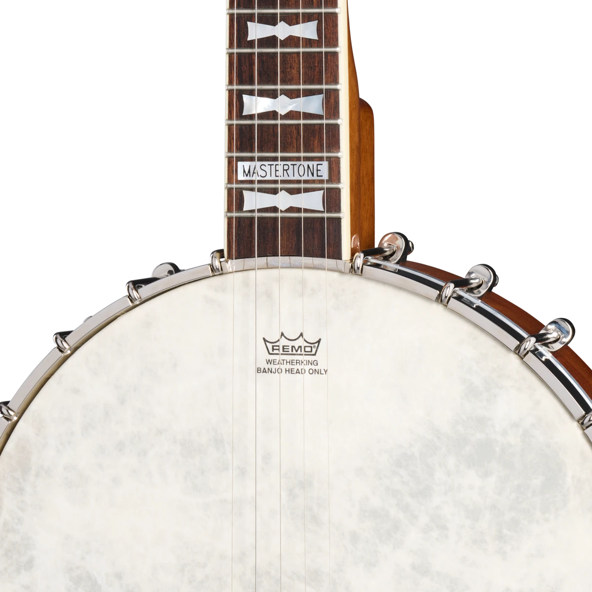 The Epiphone Mastertone Bowtie Open Back Banjo was inspired by Gibson Mastertone models with Bowtie cosmetics from the 1950s and 1960s and delivers high-quality with vintage style at an accessible price point. Perfect for clawhammer/frailing as well as Scruggs-style players, it is equipped with a 26.4 scale length satin- finished mahogany neck that features the Gibson scroll-style headstock with mother-of- pearl Epiphone logo and Gibson Crown inlays, the bound laurel fretboard has 22 frets and classic mother-of-pearl Bowtie inlays and Mastertone block inlay at the end of the fretboard.