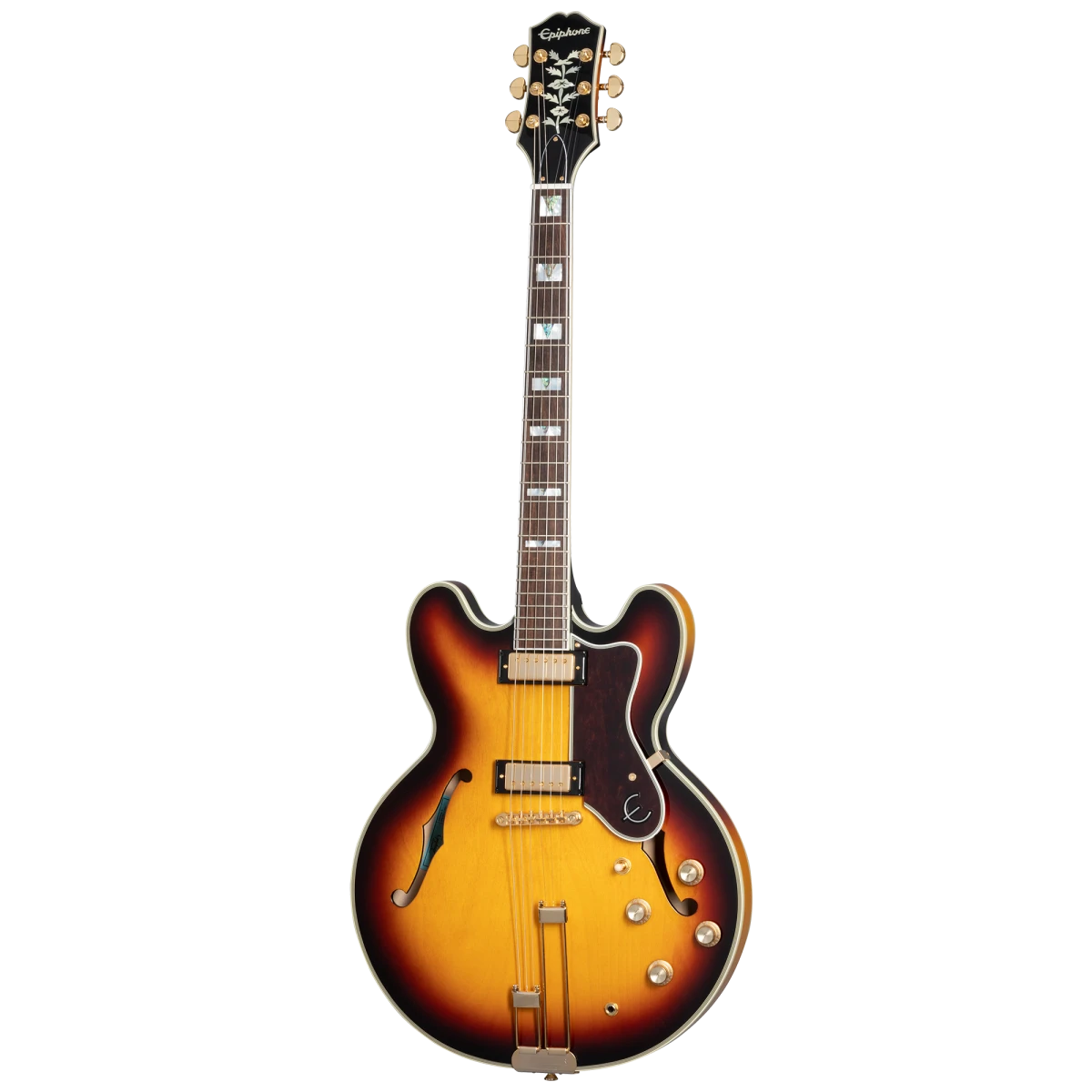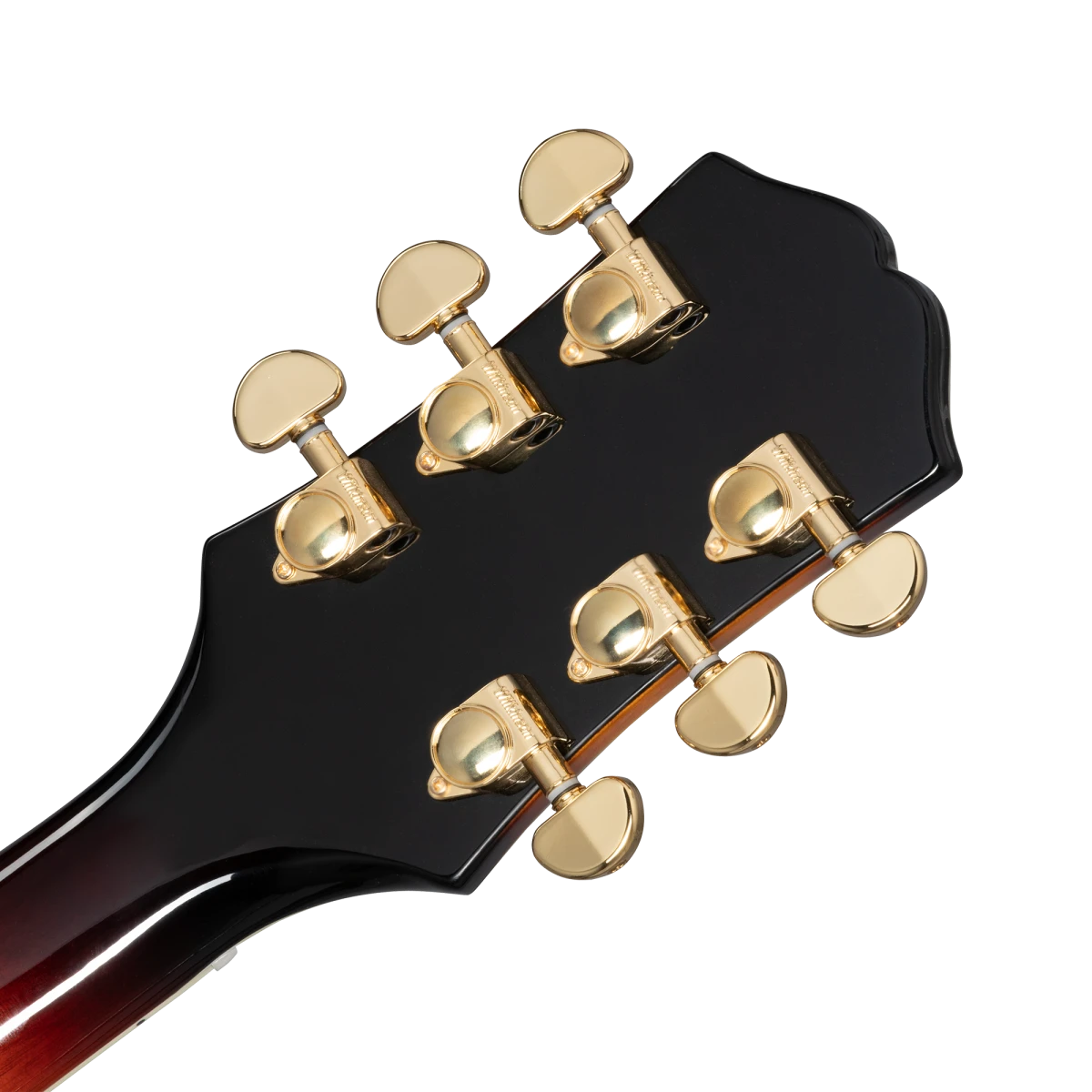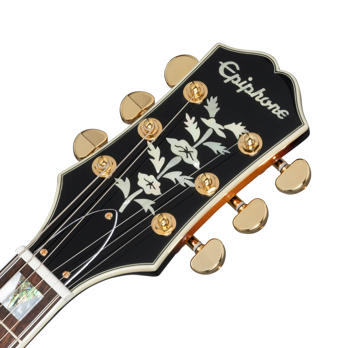 One of Epiphone’s most storied guitars, the Sheraton returns in both Vintage Sunburst and Natural finishes. This elegant instrument features a semi-hollow body crafted from layered maple with a maple centerblock for feedback resistance. The 22-fret, mahogany neck has a bound Indian laurel fretboard with block mother of pearl with abalone triangle inlays. The bound headstock has a historic Epiphone logo and tree of life in mother of pearl.