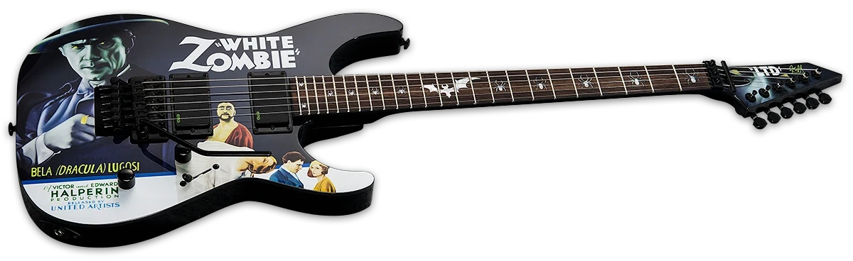 Kirk’s latest signature model is the LTD KH-WZ White Zombie, a reproduction of Kirk’s own guitar featuring artwork from the classic Bela Lugosi horror film of the same name. It features an alder body, maple neck, macassar ebony fingerboard with bat and spider inlays, a Floyd Rose bridge, and EMG active pickups. Each guitar includes a custom graphic form fitted case from the Tombstone Case Company.