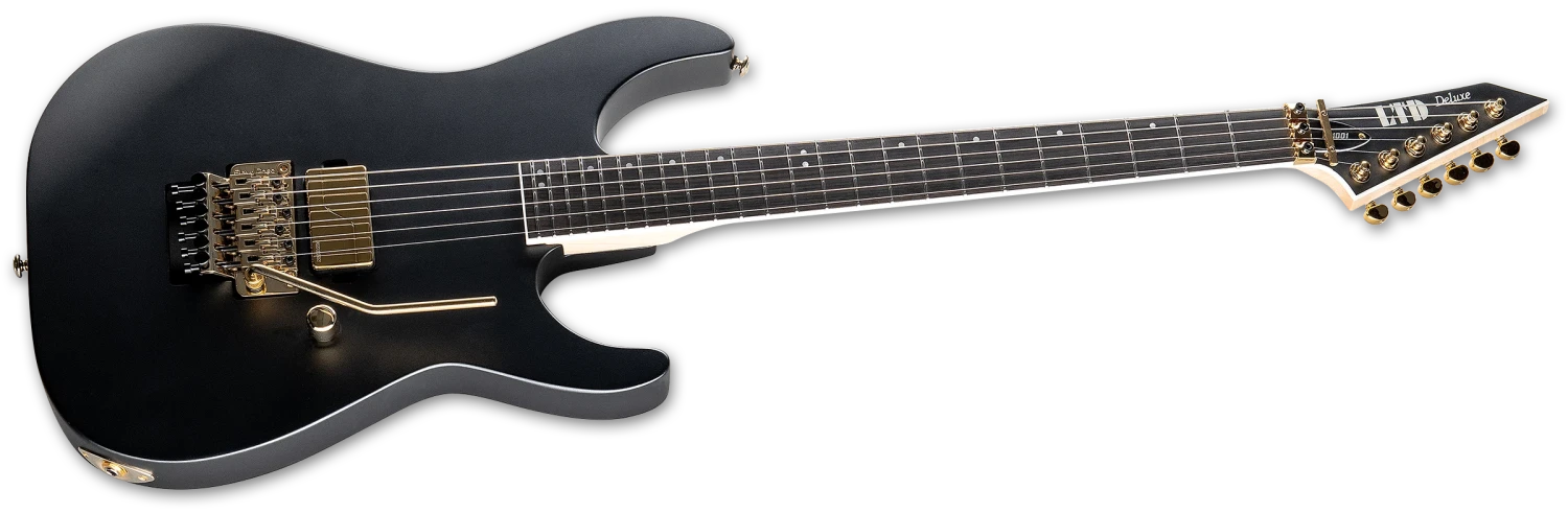 The LTD Deluxe M-1001 is designed for pure, aggressive speed, with its flat-top alder body and satin-backed, extra-thin u-shaped three-piece maple neck. Built with bolt-on construction at 25.5” scale, the M-1001 offers a bound Macassar ebony fingerboard with offset mother-of-pearl dot inlays and 24 extra-jumbo stainless steel frets, and a bound matching-finish reverse headstock for great tension where you need it (on the lower strings). Components on the M-1001NT include gold hardware with a Floyd Rose 1000 double-locking tremolo, precise Grover tuners, and a direct-mount Fishman Fluence Modern Humbucker active pickup, with a push-pull control to select voicings and a gold cover to match this guitar’s incredible aesthetics. Voice 1 is the ultimate high-output ceramic humbucker bridge pickup tone… crisp, searing crunch, tight bass with no mud, and a growl. Voice 2 delivers modern passive attack performance that has superbly organic distortion characteristics with outstanding dynamics and response.
