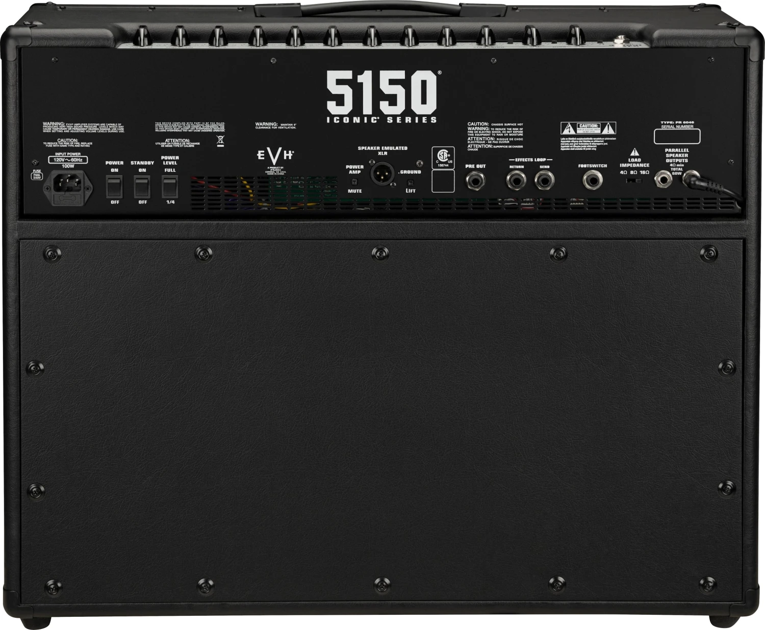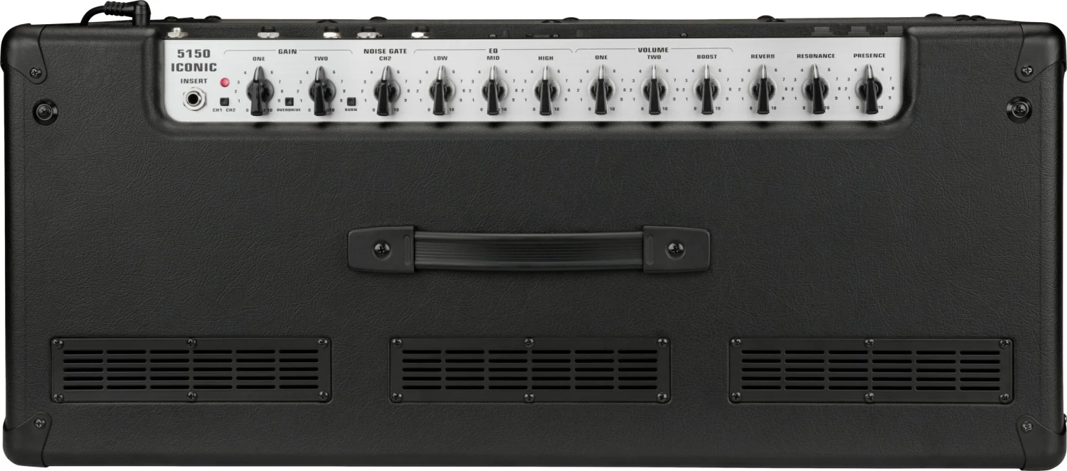 Sporting distinctive EVH style, the 5150 Iconic Series 60W 2×12 combo is wrapped in either Black or Ivory textured vinyl with a black cloth front grille and features silver and black 5150 and EVH logo badges in the upper left and lower right corners. This all-tube combo is finished off with a brushed aluminum top panel, vintage-style chicken-head knobs and molded black plastic top handle.