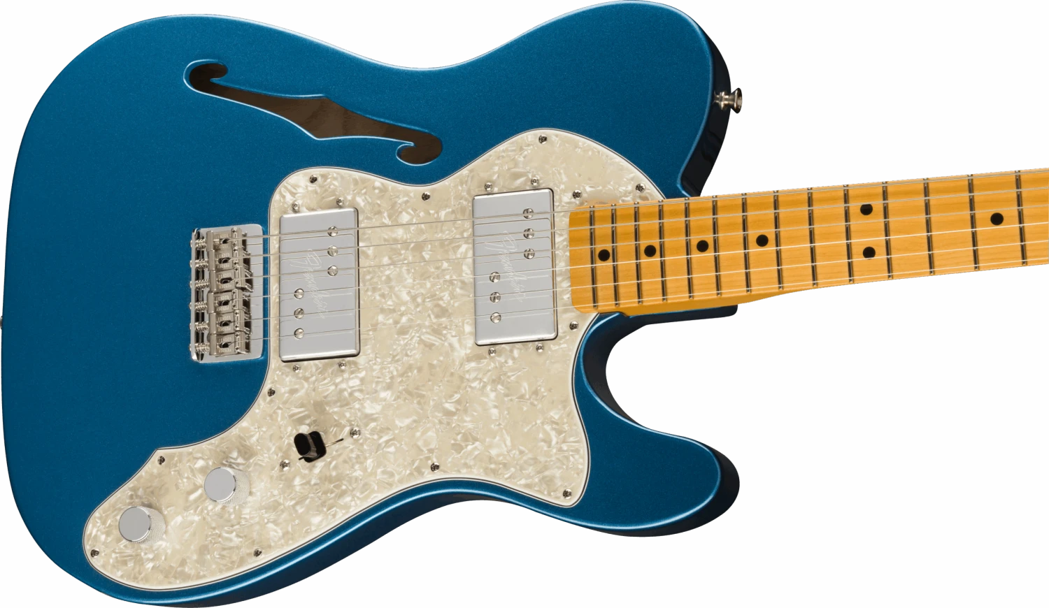 Featuring a “C”-shape hard rock maple neck, the American Vintage II 1972 Telecaster® Thinline plays like a dream with a 7.25″ radius fingerboard and vintage tall frets. To create authentic Wide-Range humbucking pickups, we resurrected CuNiFe magnets, an essential element in recreating the sonics of the originals. Characteristic of production in 1972, this Thinline is outfitted with a convenient “Bullet” style truss rod nut, three-bolt neck plate with Micro-Tilt™ mechanism, “F” stamped tuners, 6-saddle string-through body hardtail with bent steel saddles and offered in Aged Natural, 3-Color Sunburst, and Lake Placid Blue over a semi-hollow ash body.