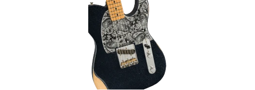 The Brad Paisley Esquire features a paulownia and spruce body finished in a stunning black sparkle Road Worn lacquer, a custom Enhanced “V”-shaped maple neck with a 9.5” radius fingerboard and custom pickups—including a Brad Paisley signature Seymour Duncan Secret Agent neck pickup hidden under the black and silver paisley pickguard.