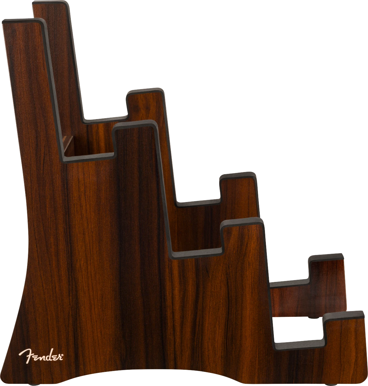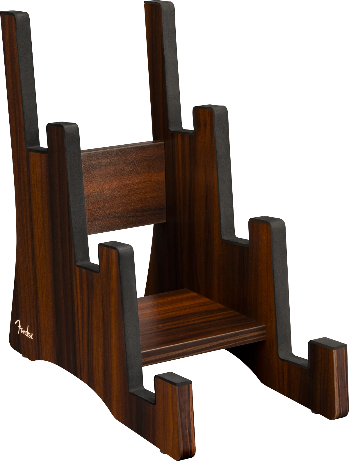 Three guitars at your fingertips! The Fender Deluxe Wooden Tiered Guitar Stand features an eye-catching, mid-century modern design that offers quick access to your favorite electric guitars. The tiered construction allows you to safely display your instruments while maximizing space through its compact design.