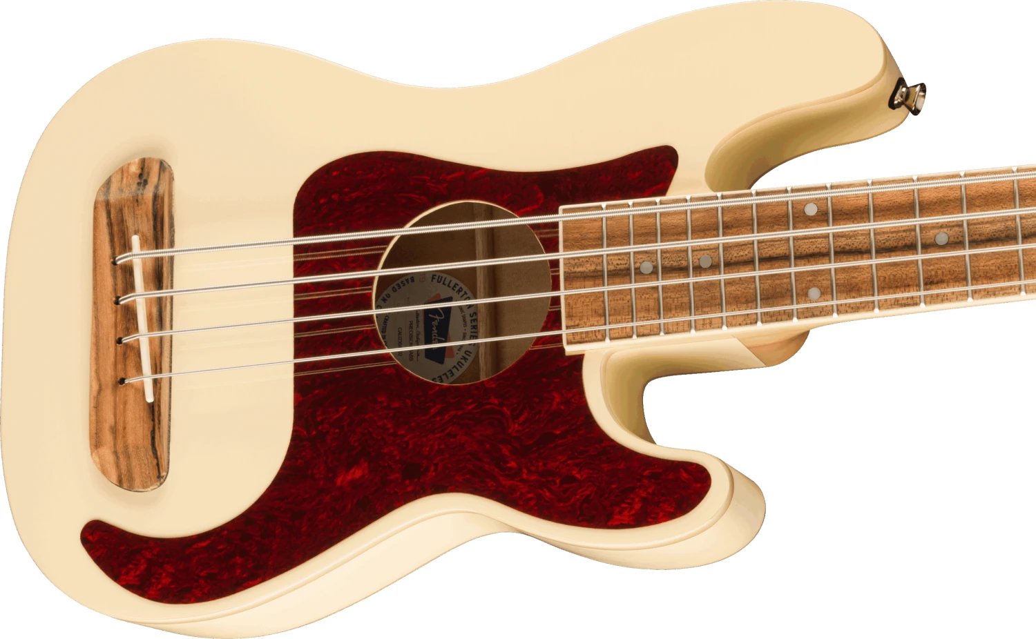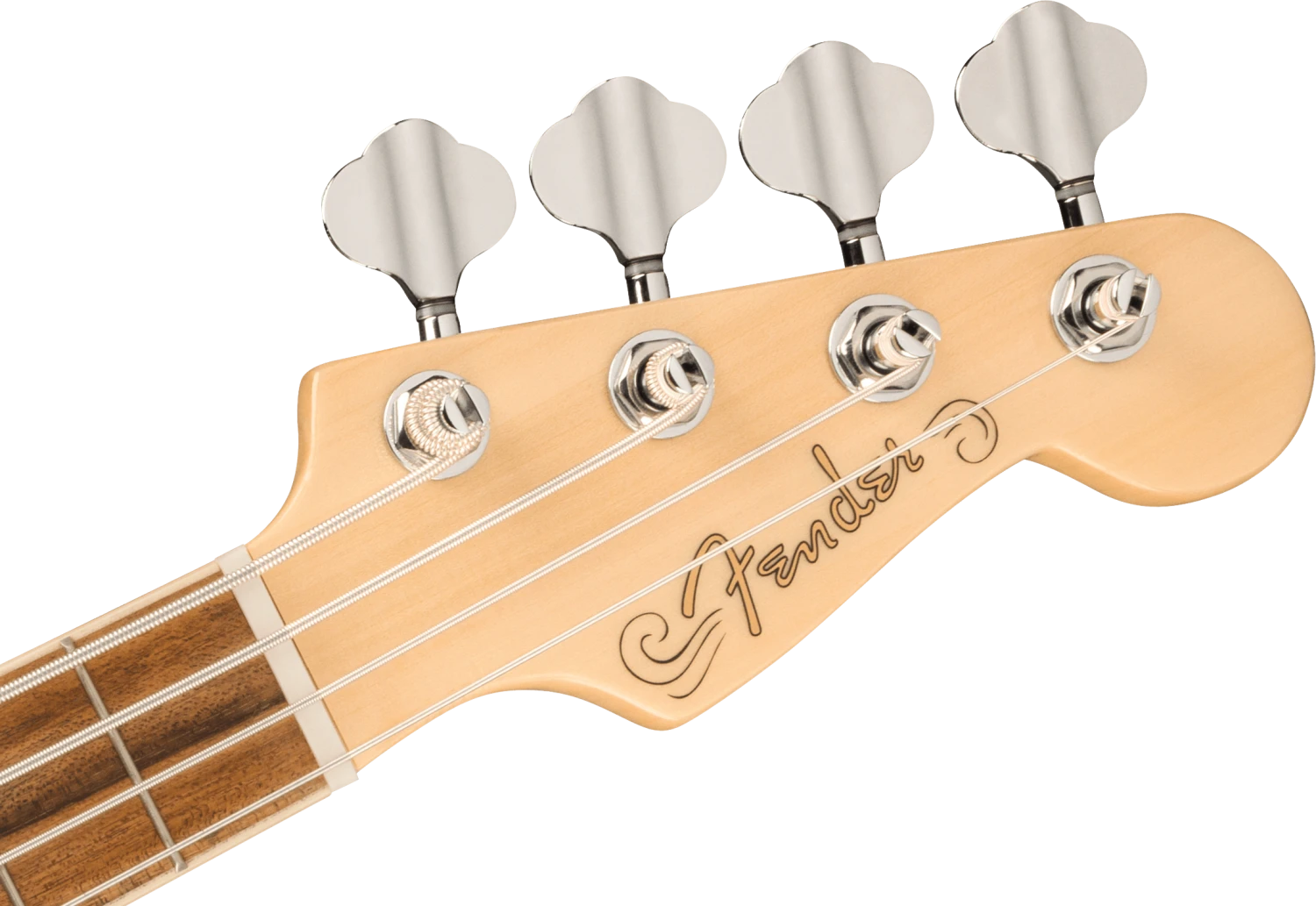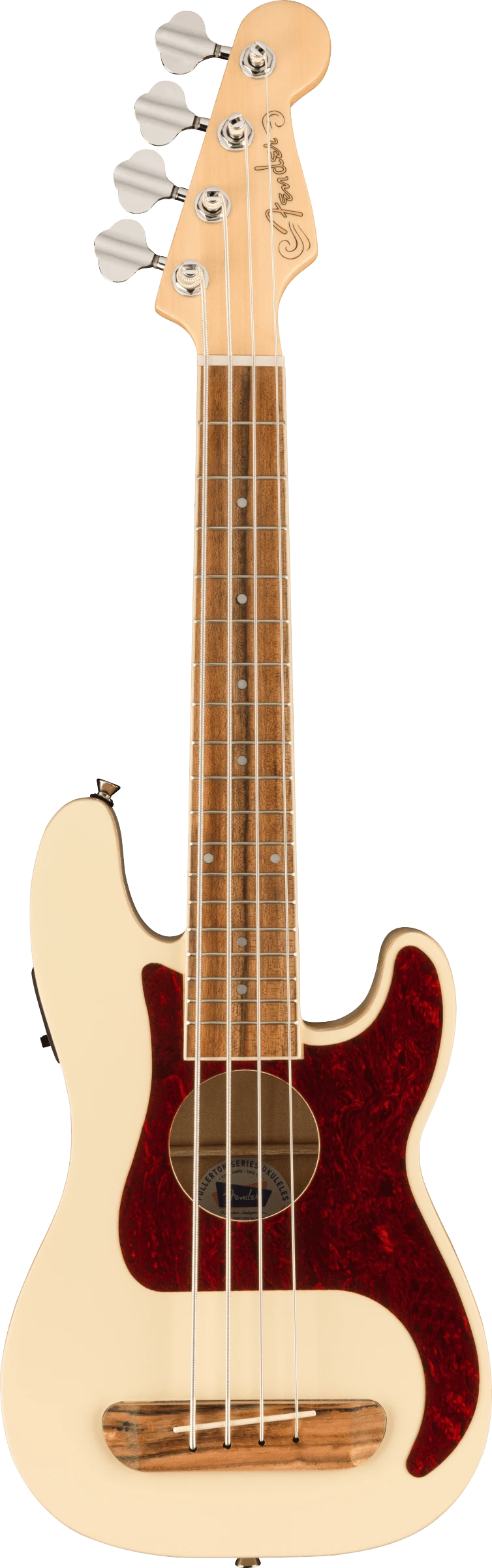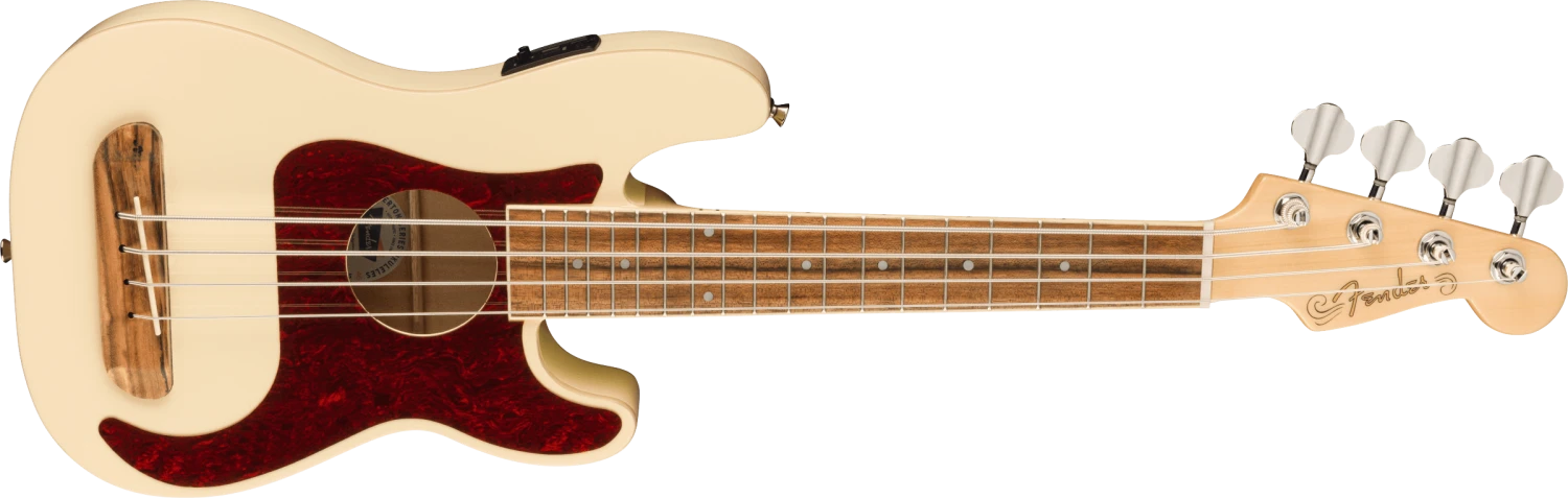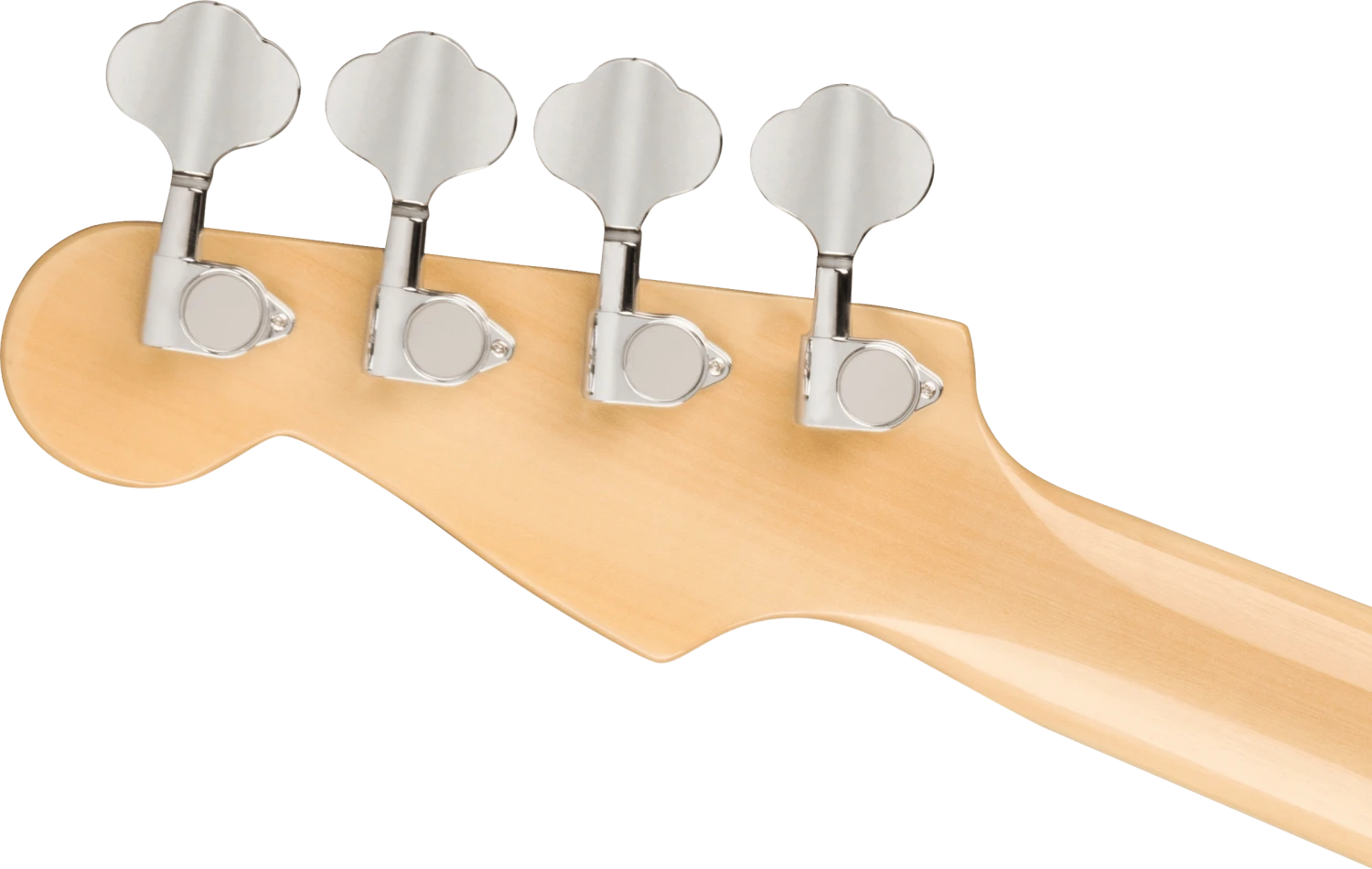 A celebration of Fender’s pioneering electric bass design in a refreshingly fun size, the Fullerton Precision Bass® ukulele is nothing short of electric. Uniquely portable and performance-ready, the Precision Bass ukulele features an approachable 20.25″ scale length, compact proportions and surprising lightness, making it remarkably easy to pick up and impossible to put down. With a built-in tuner for on-the-fly adjustment and intuitive controls for volume and tone, the on-board preamp packs an articulate low-end and big tonal personality that punches far above its weight. Offered in classic Fender colors with a signature Precision Bass pickguard and headstock shape, this bass is ready to lay the foundation for any player at any stage.