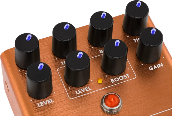 Designed by our in-house team of experts, the MTG:LA® Tube Distortion is an all-original Fender circuit. The chassis is crafted from lightweight, durable anodized aluminum, and the Amp Jewel LED gives your pedalboard the classic Fender look. The switchable LED-backlit knobs show your control settings on a dark stage at a glance.