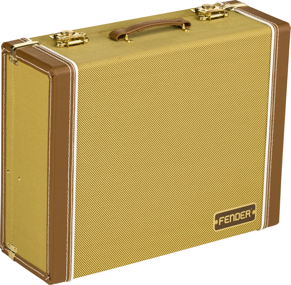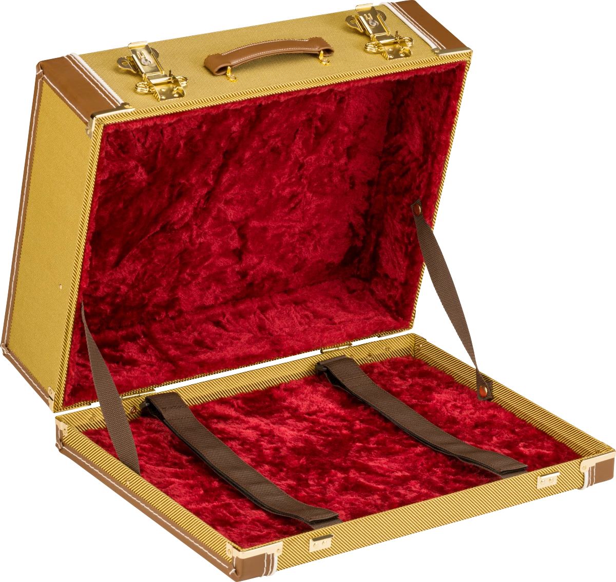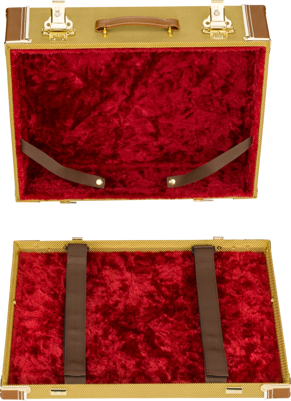 The unmistakable look of a Fender tweed case now available for your pedalboard! Available in three different sizes, these cases fit nearly every pedalboard currently available on the market. Constructed from 3-ply wood, lockable butterfly latches, and red poodle plush interior with additional padding for extra stomp box security. Also features an optional removable lid.