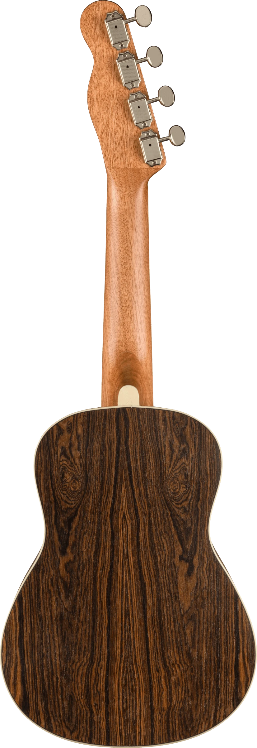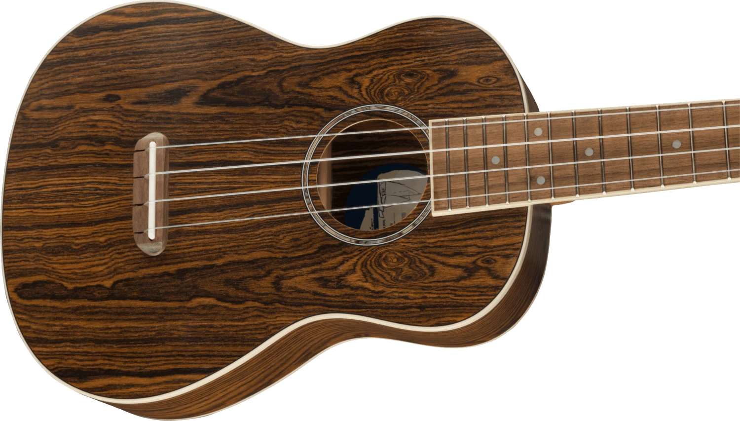 The Zuma falls between the smaller soprano and the larger tenor sizes, providing a full sound and comfortable playing experience for players with larger hands. The easy-playing 16-fret neck extends the range, while the pull-through bridge makes changing strings quick and easy. A striking abalone rosette, bound top, back and fingerboard and 4-in-line Tele® headstock, stand out from the crowd with plenty of Fender vibe.