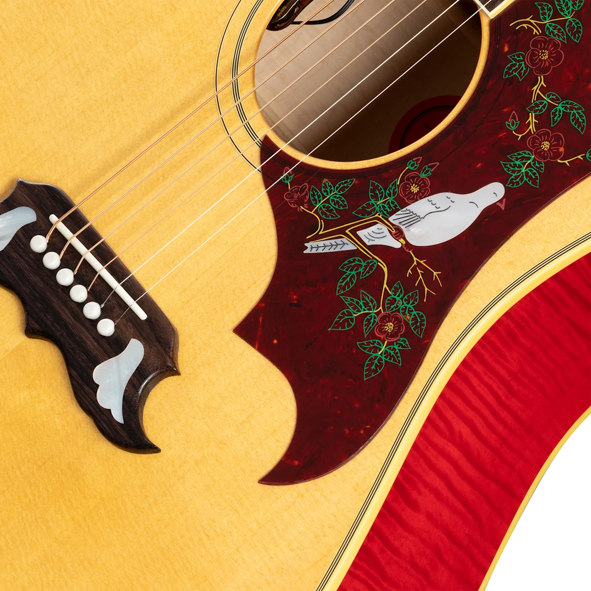 This famous flame maple-backed square-shoulder introduced in the early 60s is intertwined with one of the most revolutionary decades in popular music history. Its maple back and sides and long scale produce crisp, clear tone and projection, while the square-shoulder body adds balance and warmth. Classic Dove™ details include a bone nut and saddle, double antiqued multi-ply binding, nickel Grover® Keystone tuners, a traditional Dove truss rod cover, and a cherished pickguard featuring an inlaid mother-of-pearl Dove with hand-engraved and painted detailing.
