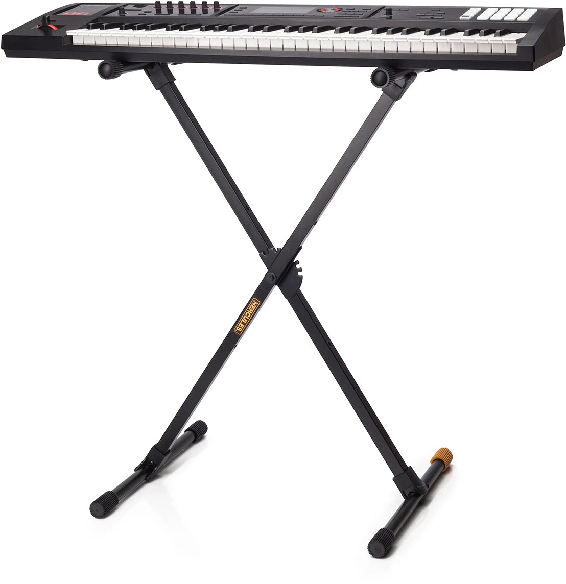 The HERCULES TravLite Keyboard Stand KS118B has a compact one-piece design that features the Trigger Height Adjustment with 6 settings. This stand is easy to set up and tear down.