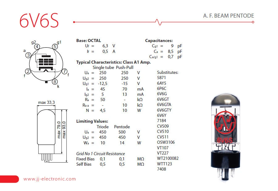 6V6 S is a beam power pentode with octal base and a maximum plate dissipation of 14W. It has fat low end and full mid tones with very good tone separation and a smooth, clean high end. Known to be a very powerful 6V6 due to its robust construction. In general, a very balanced tone. It can be used also in some 6L6 amplifiers.