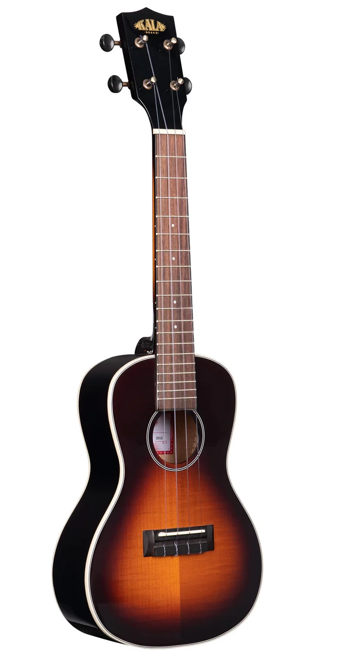 Our Gloss Flame Maple ukuleles are highlighted by either a warm red Cherry Burst that fades from the edges into a golden center or an earthy brown Tobacco Burst that fades from the edges to a golden center. The iridescent striped wood grain is trimmed in white binding and a shiny, gloss finish. Not only are these instruments dazzling to the eye, but Maple has a clear, transparent tone, and ample projection with great note separation.