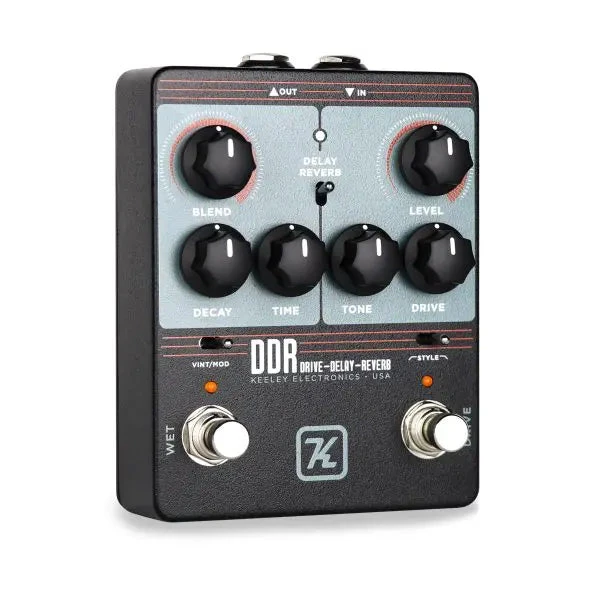 The DDR combines the most common guitar effects–DRIVE and WET–into one pedal. Choose between two classic overdrive tones and then pour on some delay or reverb. The DRIVE section gives you two styles of overdrive to choose from: Crunch or Lead. The Crunch Style gives you a gritty British tube-amp combo sound. The Lead Style gives you a warm and dark, mid-pushed overdrive. The WET side of the pedal gives you Delays and Reverbs.
