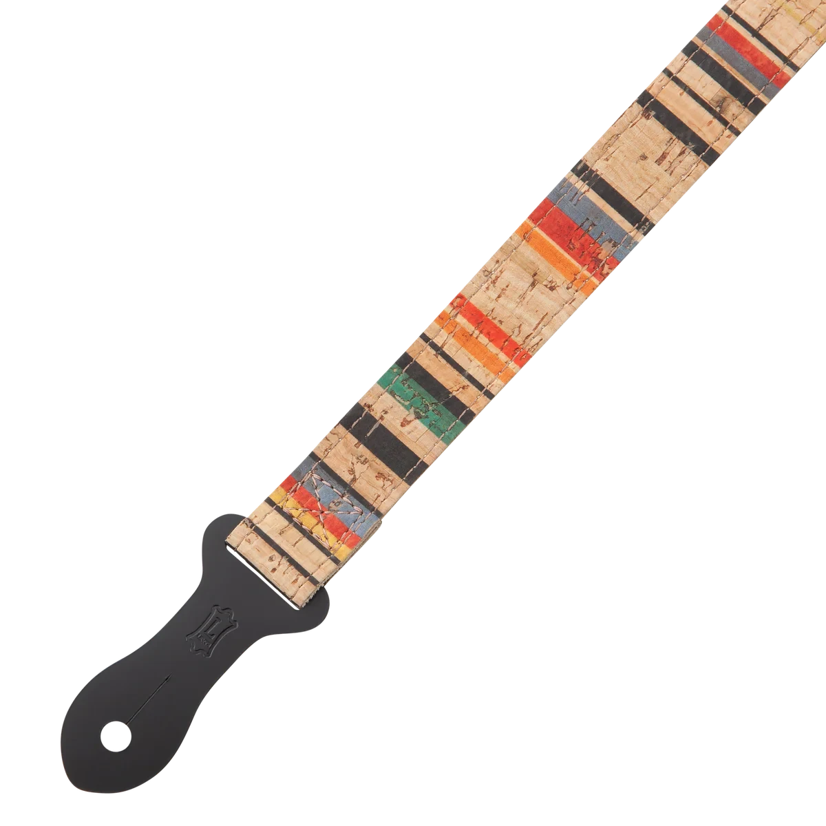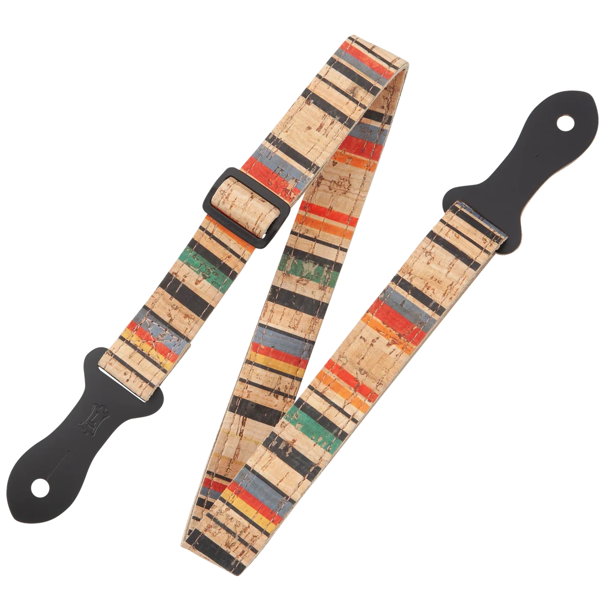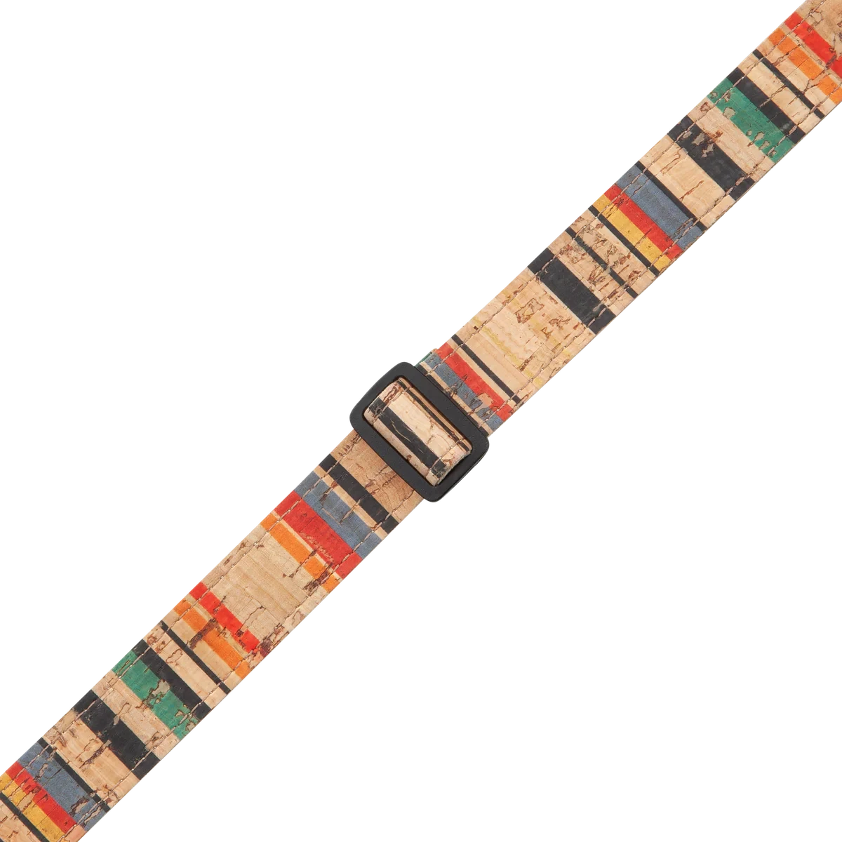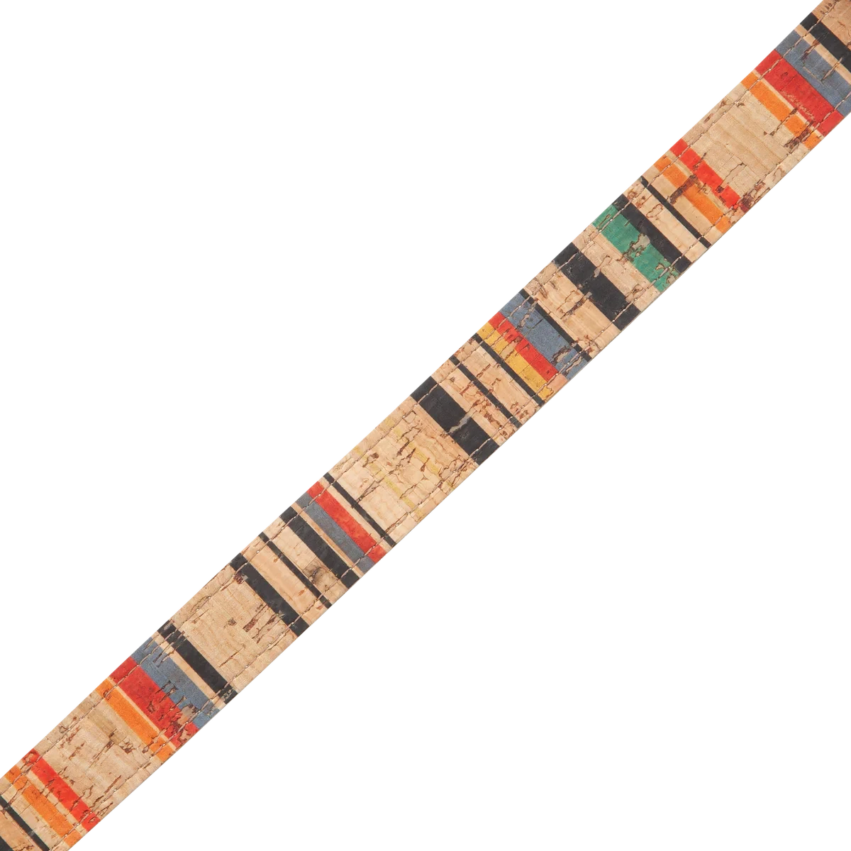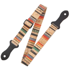 - Two-ply natural cork multi-use strap with chrome tan leather ends. Black plastic loop and slide hardware. Adjustable from 29 to 49″.
