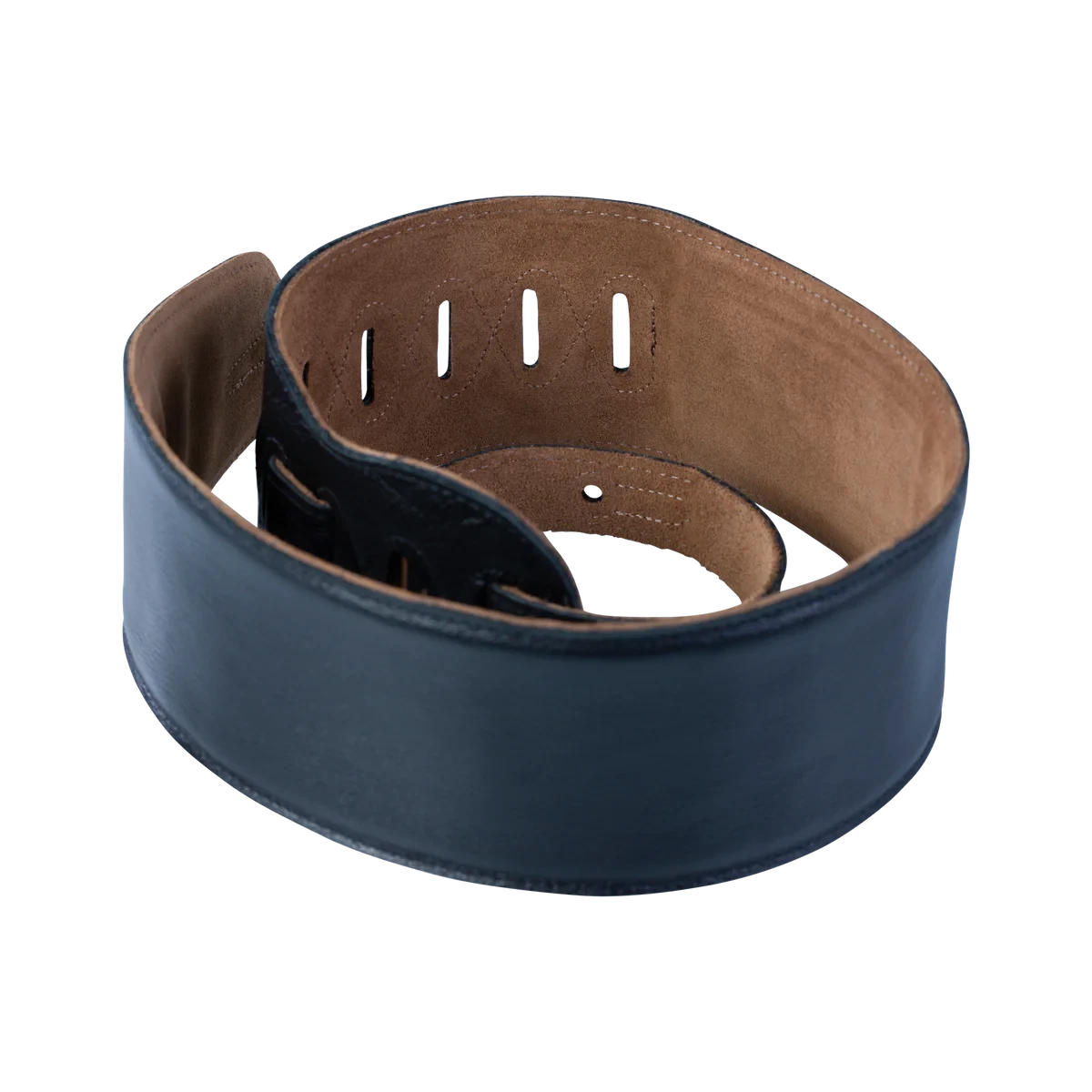 - Levy’s 3 1/2″ Wide Black Garment Leather Bass Guitar Strap With Natural Suede Back.