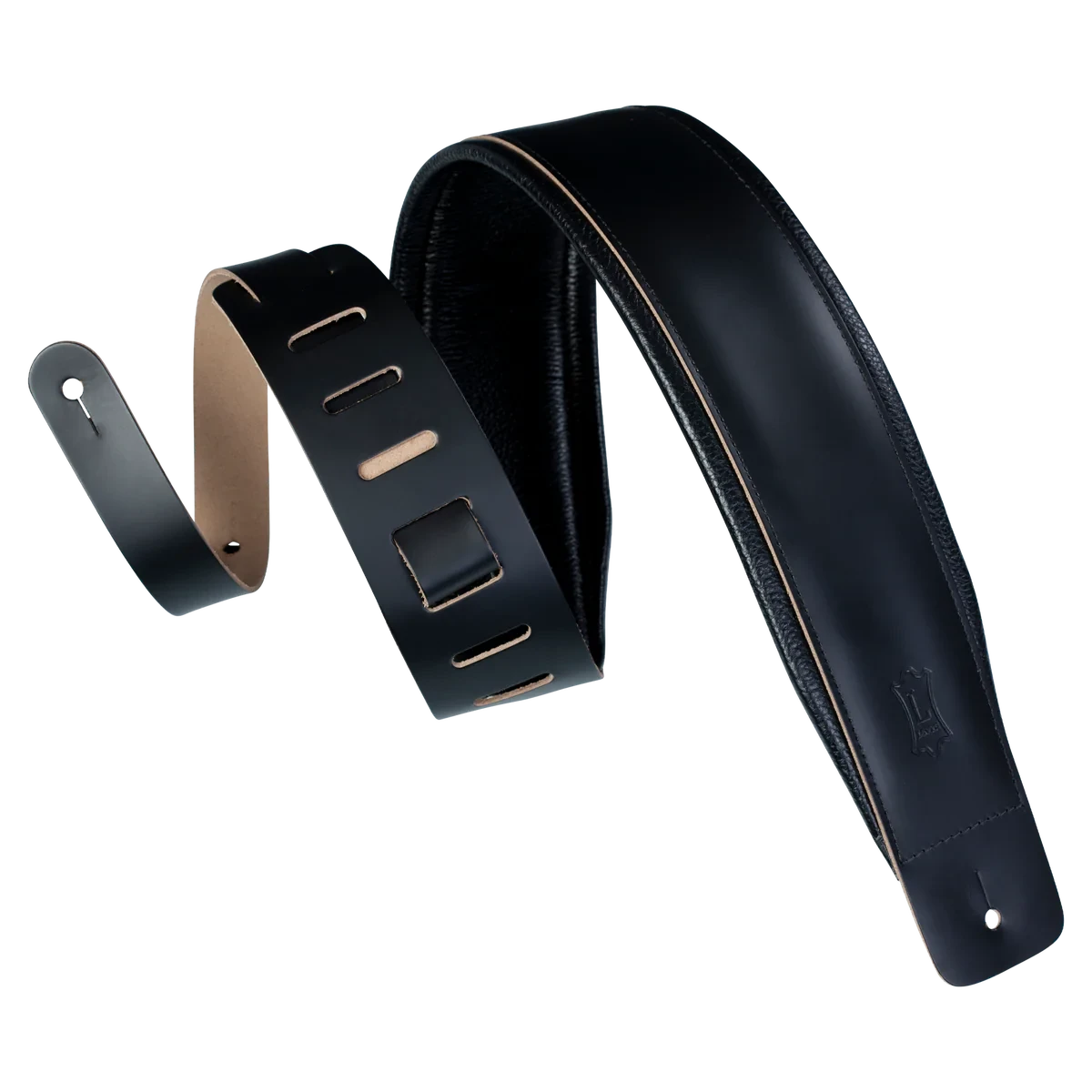 - Levy’s 3″ Wide Top Grain Leather Guitar Strap In Black.