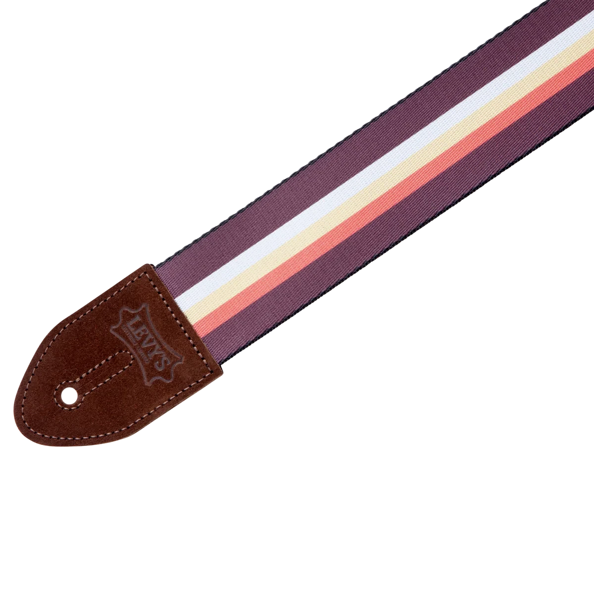 - One-ply printed polyester guitar strap with suede leather ends and vintage logo. Black plastic loop and slide hardware. Adjustable from 35″ to 60″.