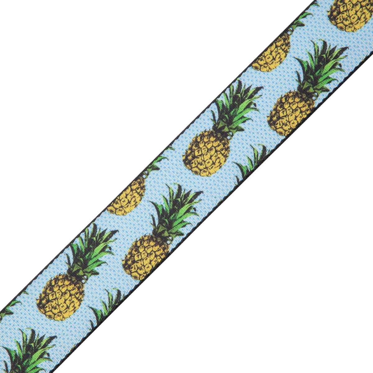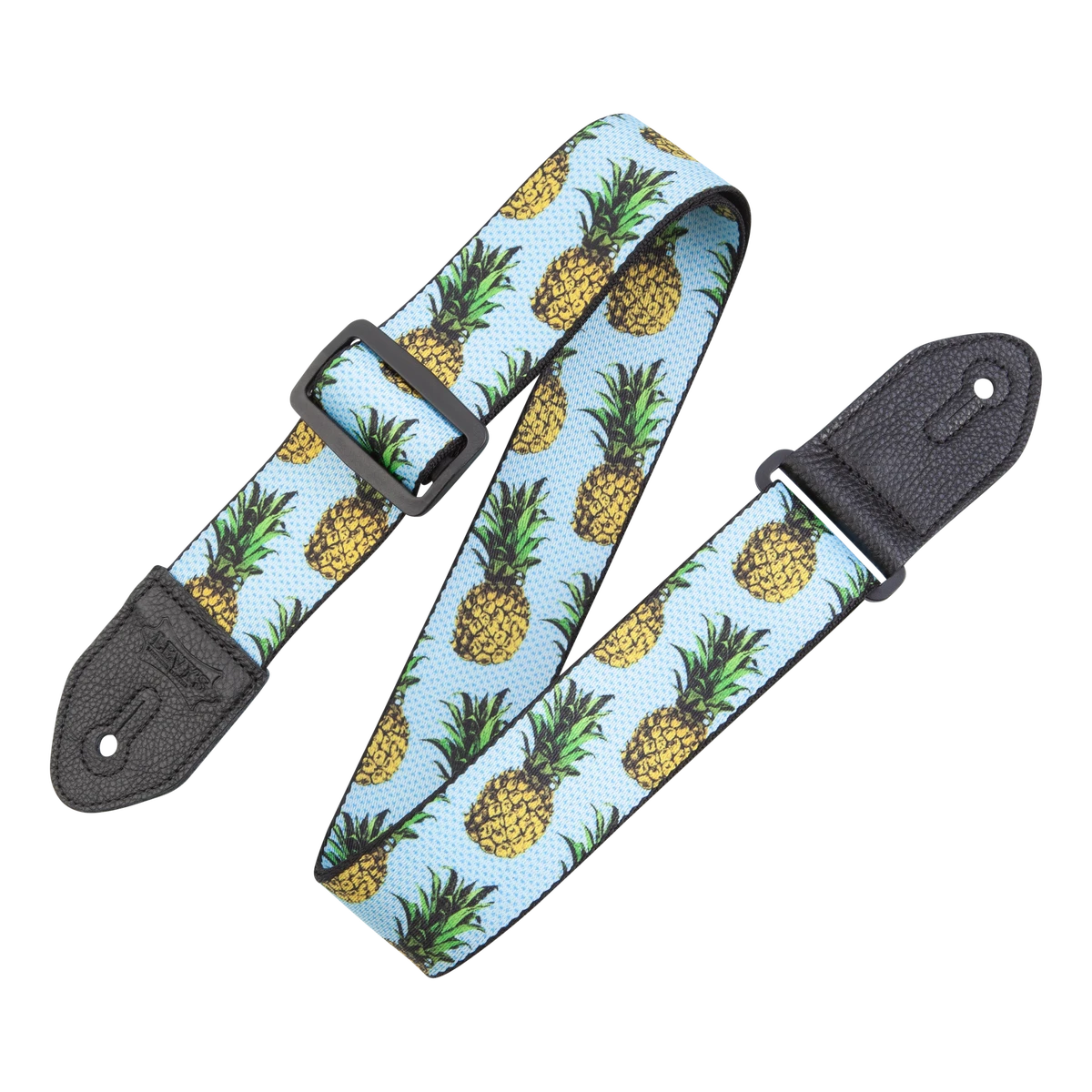 - One-ply printed polyester guitar strap with garment leather vintage ends and vintage logo. Black plastic loop and slide hardware. Adjustable from 35″ to 60″.