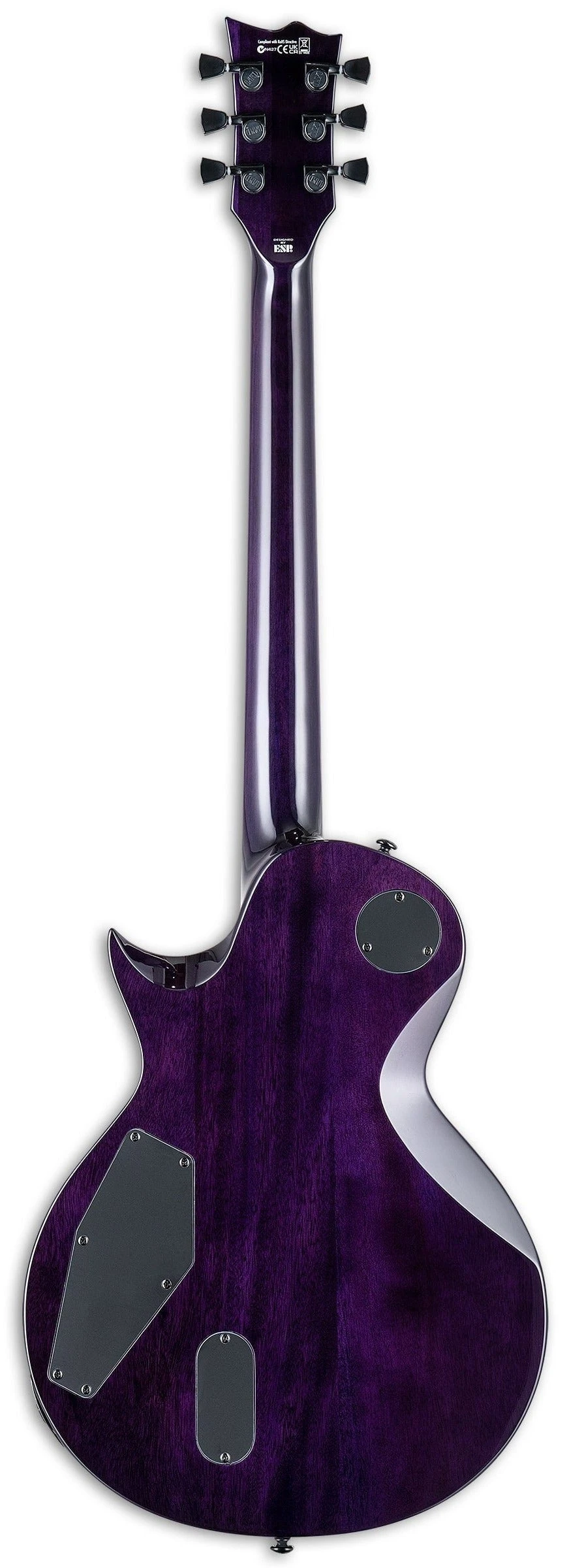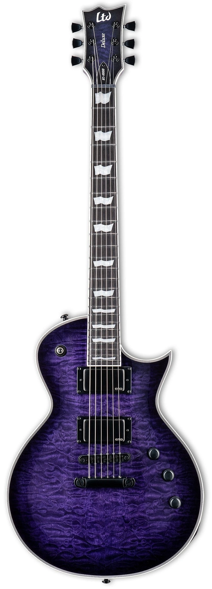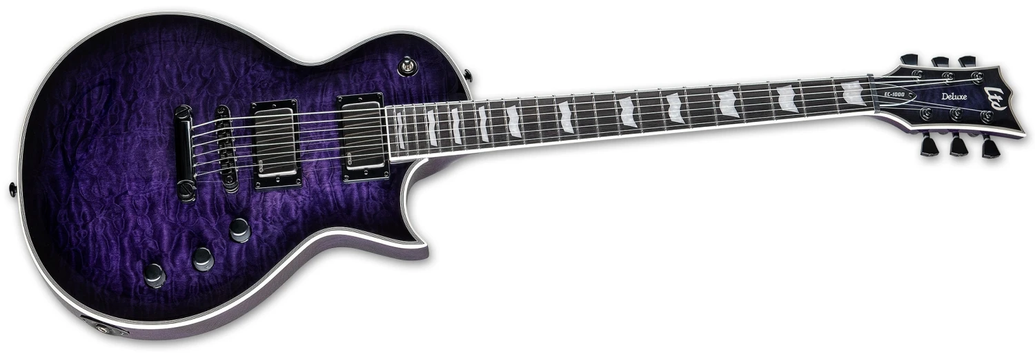 Guitars in the LTD 1000 Series are designed to offer the tone, feel, looks, and quality that working professional musicians need in an instrument. This EC-1000 offers an amazing quilted maple top in See Thru Purple Sunburst finish. Ready for pro-level performances in any genre of music, this guitar offers a set-thru three-piece mahogany neck at classic 24.75” scale, along with a mahogany body. Its Macassar ebony fingerboard has ESP flag inlays and 24 extra-jumbo stainless steel frets for excellent longevity and the smoothest string bending experience. Its sound is powered by a versatile set of a EMG 60TW-R in the neck, with a coil splitting control and the coils reversed so the single coil is closest to the neck, and an aggressive EMG 81 in the bridge position. Other features of this outstanding guitar include multi-ply white binding, black hardware, LTD locking tuners, and a TonePros locking TOM bridge and tailpiece.