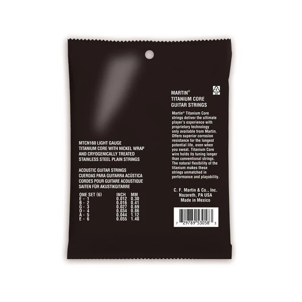 Martin Titanium Core strings deliver the ultimate player’s experience with patented technology from Martin. Titanium Core strings provide the most superior intonation and tuning stability of any string on the market. Titanium is naturally more flexible than steel, but just as strong, so the strings are easier to press, reducing finger fatigue. The combination of titanium and pure nickel used in our Titanium Core strings provides natural corrosion resistance, meaning they will last a really, really long time under normal circumstances.