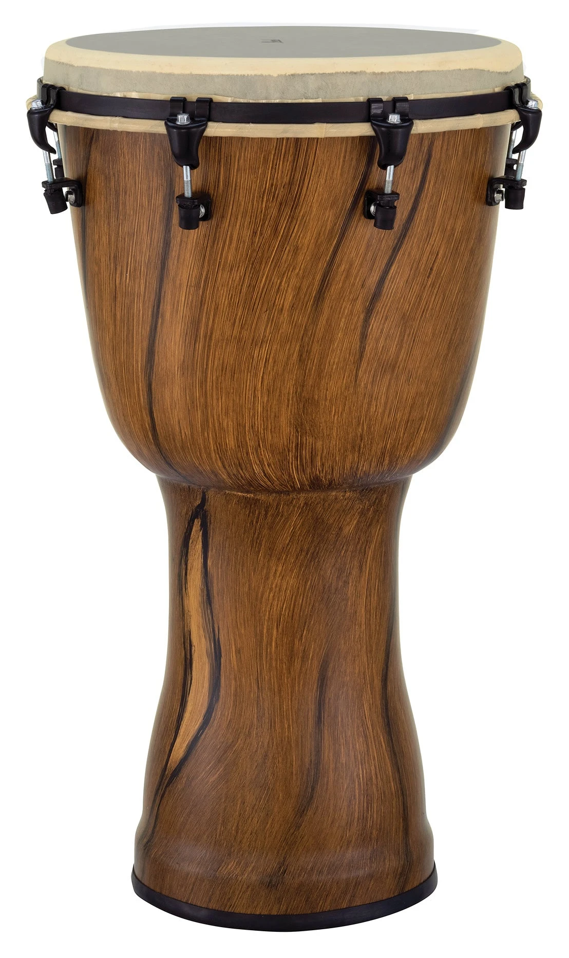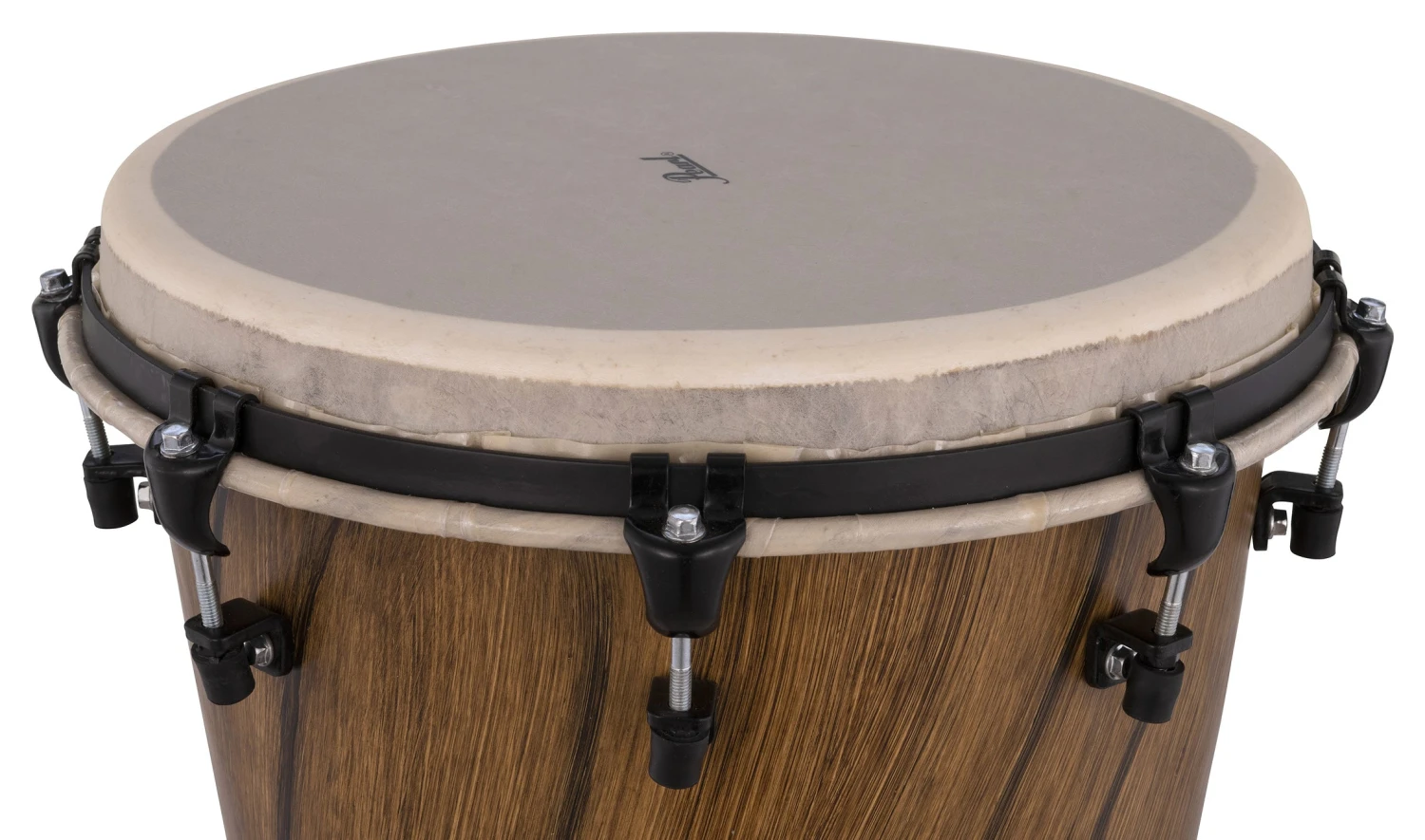 Traditional djembes are roped tuned and that tuning method requires considerable experience. Pearl’s Top Tuned djembes makes tuning your drum easy with a hoop and lug system that works like other acoustic drums. Care Guide: Pearl Top Tune Djembe drums feature a synthetic shell that is subject to react to extremely hot conditions. Refrain from prolonged exposure to temperatures at or above 122°F / 50°C. Failure to do so may result in damage to the instrument. For the utmost in care, we recommend a moderate stable climate suitable for humans.