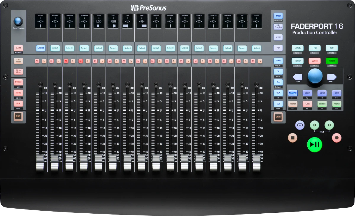 A superior solution for anyone who mixes in the box, only the FaderPort 16 provides 16 100 mm touch-sensitive, motorized faders in a compact chassis that easily sits on any desk. Like PreSonus®’ popular FaderPort 8, the FaderPort 16 features digital scribble strip displays; mute and solo for every channel; complete automation and transport control; plus level, pan, send, and plug-in control modes for every fader. The unique Session Navigator makes mixing and controlling your favorite DAW application quick and easy by putting eight critical functions under your fingers, including navigation, zoom, and master fader control. The FaderPort 16 is compatible with virtually any DAW host for Mac® or Windows®, with support for HUI and Mackie Control, including customized Mackie Control modes for Logic, Cubase, and Sonar. Its native Studio One® support provides even more functionality with PreSonus’ easy-to-use DAW, including Control Link support as well as parameter follow, allowing you quick access to any control under your mouse. Its ergonomic design makes it a comfortable companion to your keyboard and mouse.