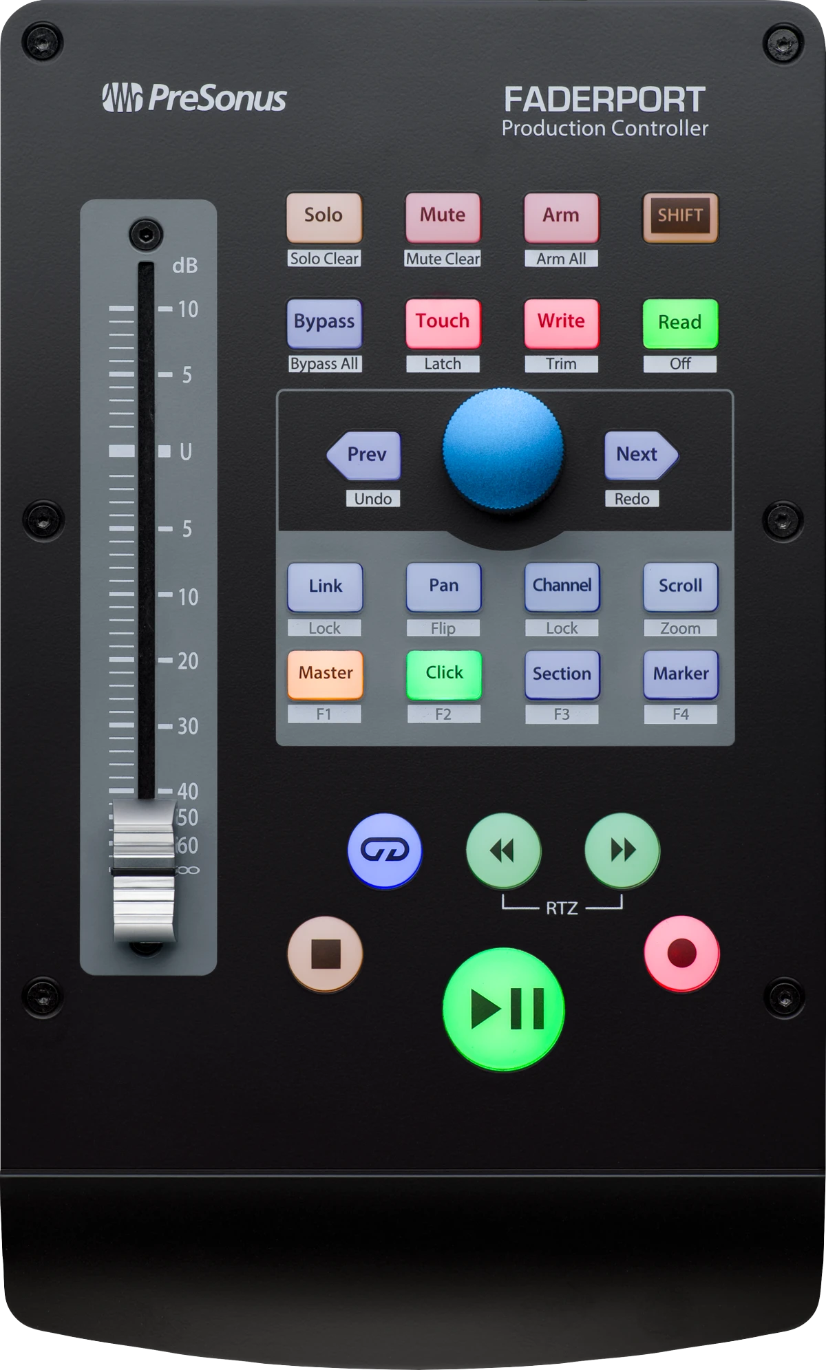 The FaderPort’s unique Session Navigator provides easy access to eight mission-critical functions for maximum flexibility. Use the large encoder button and companion buttons to edit and mix with greater efficiency and speed. Scroll through your timeline or work measure by measure; zoom in and out on the timeline and make your tracks larger or smaller; navigate and drop markers; even maintain constant control of your main level. Once you start using the Session Navigator, you’ll wonder how you mixed without it.