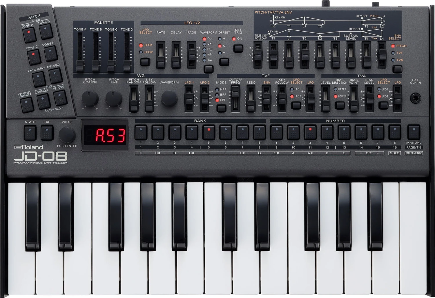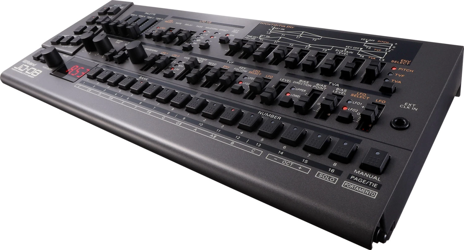 With its retro workflow, evocative sounds, and powerful effects, the JD-800 was a favorite for top electronic music producers through the ’90s and beyond. Combining the original JD-800 waveforms with advanced modeling techniques, the JD-08 delivers the exquisite hands-on sound design of the original, along with hugely expanded polyphony, a two-part polyphonic sequencer, and other modern updates