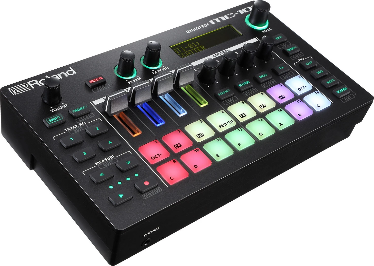 Produce and perform music anywhere, anytime—without clutter or complications. The MC-101 GROOVEBOX has all the high-quality sounds, sequencing, and effects of the expansive MC-707 in a compact four-track version that’s go-everywhere portable. Get started with an inspiring collection of ready-to-go sounds and patterns, or easily create your own. Craft a unique style by importing custom sounds, loops, and clips that sync to tempo. And you can perform with the MC-101, triggering clips and shaping your sounds with direct, hands-on control.